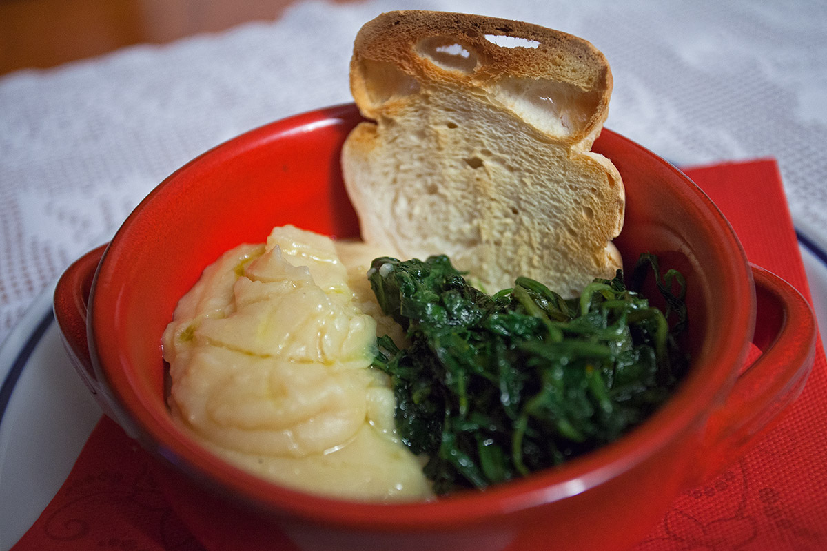 Un piatto contadino della tradizione pugliese e lucana: crema di fave con patate e cicoria selvatica (tarassaco), semplice e profumato di campagna.
