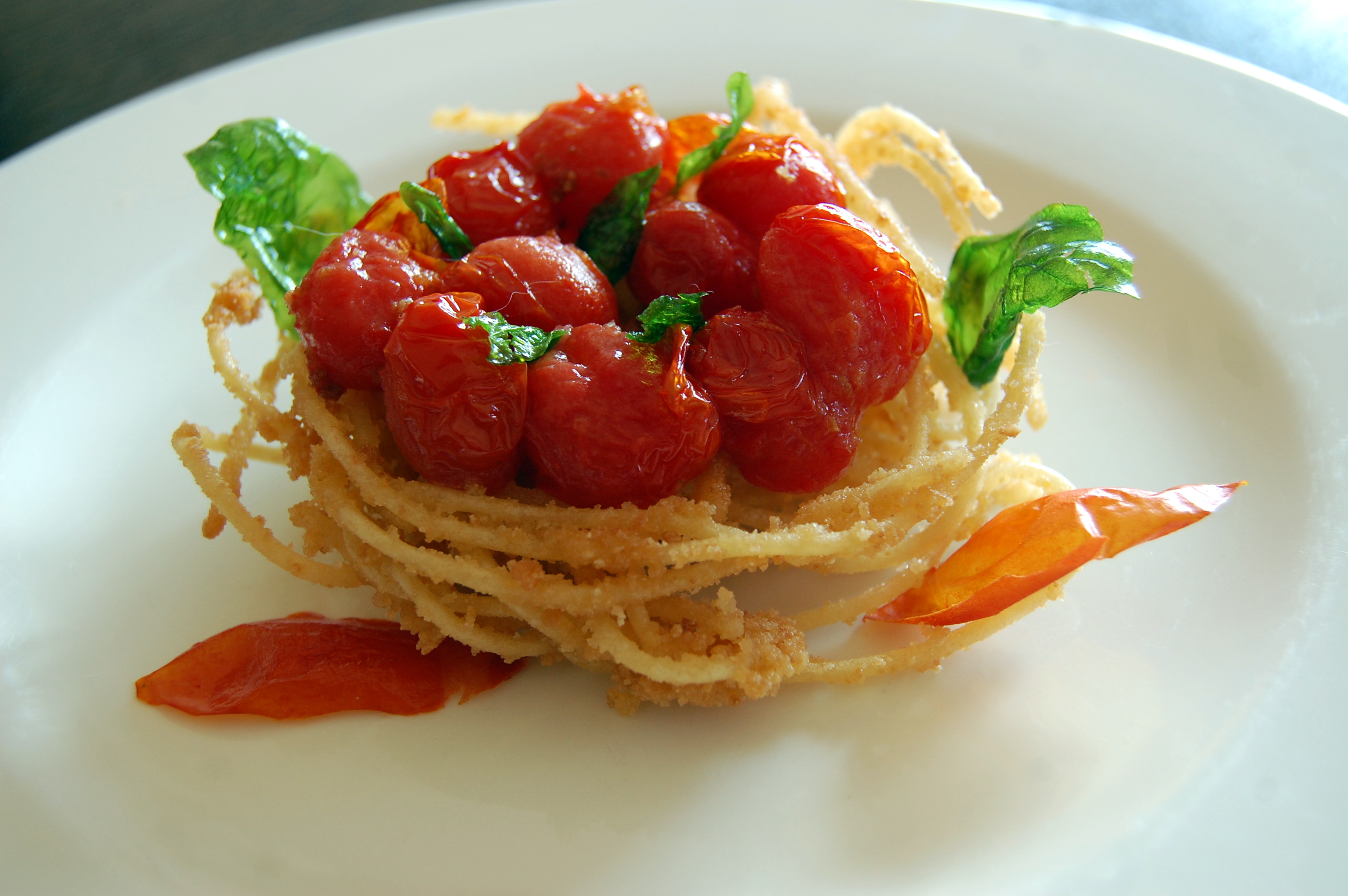 Il datterino giallo è divertente, ma in salsa rende meno anche perchè ha un'acidità più marcata. Spero che la crema di formaggio abbia compensato, ma avrebbe dovuto utilizzare un buon pecorino siciliano o comunque un formaggio stagionato. Non mi piace la presentazione, simil minestrina, e il girigori a spirale... Il tipo di pasta le "conchigliette"(come prima, tipo minestrina)