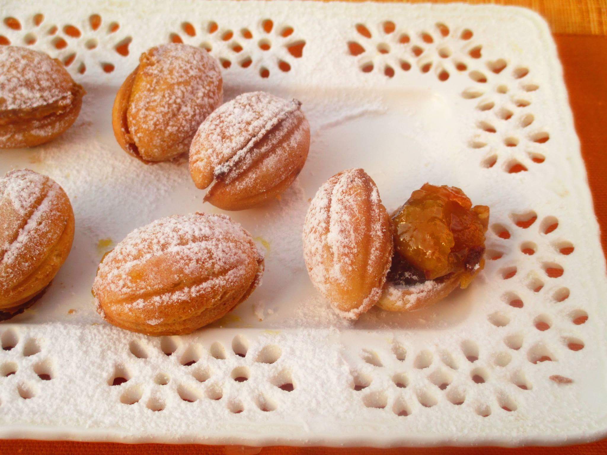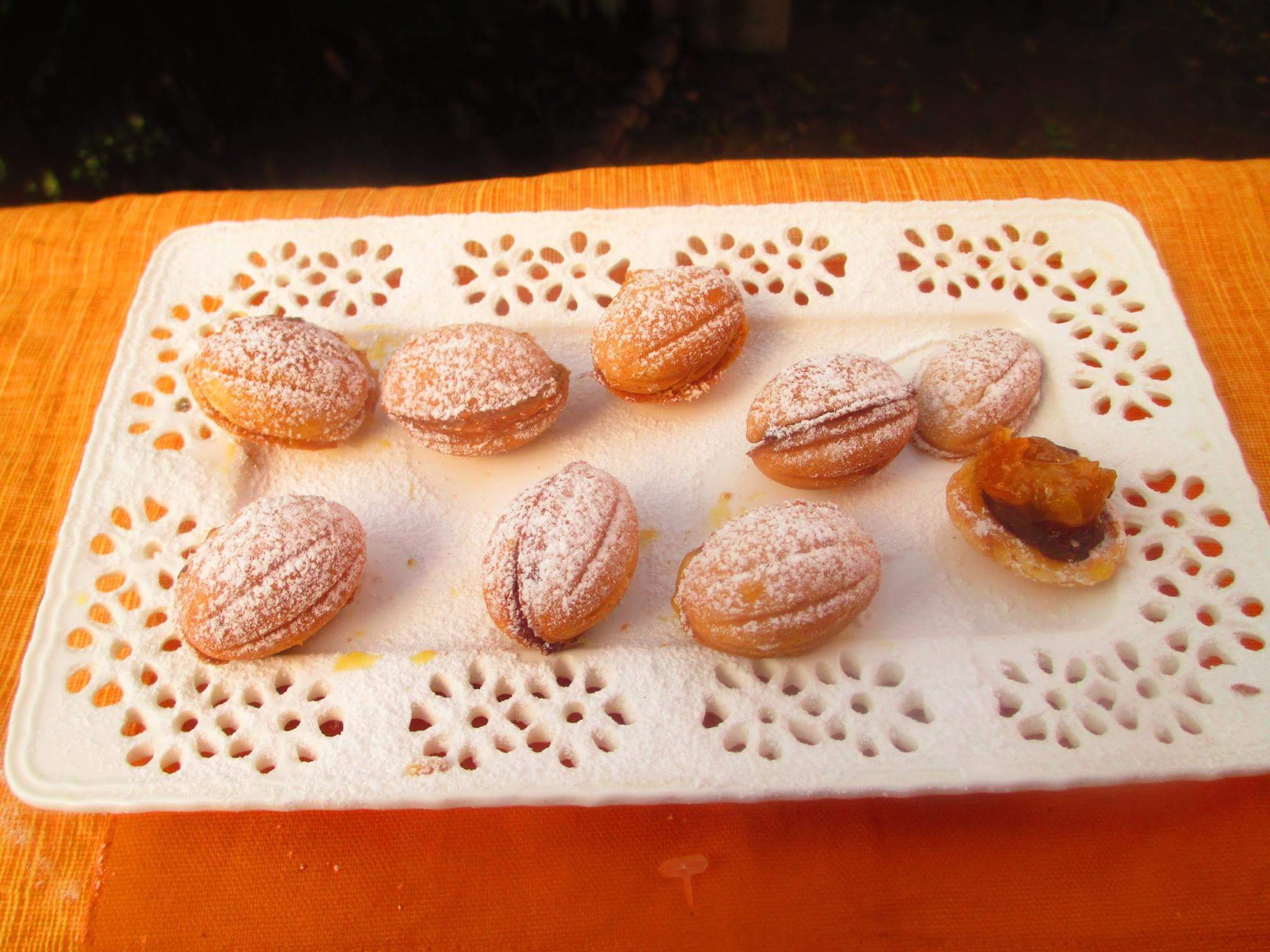 Staccare dei pezzettini di frolla di 6/7 grammi,e dargli una forma ovale.Cuocerli nella cialdiera per pochi minuti(2 circa ma controllare),Farcire con crema di nocciole oppure con marmellata o crema pasticcera.Io ho usato ganache al ciocco fondente abbastanza soda,e un cucchiaino di marmellata all'arancia,