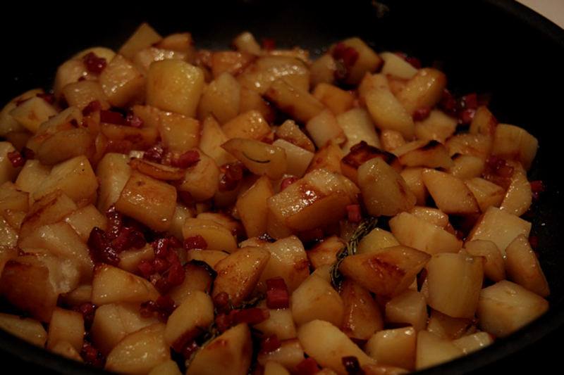 In una padella mettere un goccio di olio di oliva,i ciccioli grassi,farli diventare traslucidi.Aggiungere i cubetti magri e lasciare scaldare.Alzare la fiamma,mettere le patate ,farle rosolare allegramente .Abbassare poi la fiamma ,coprire e girare ogni tanto fino a cottura ultimata.Pepare abbondantemente