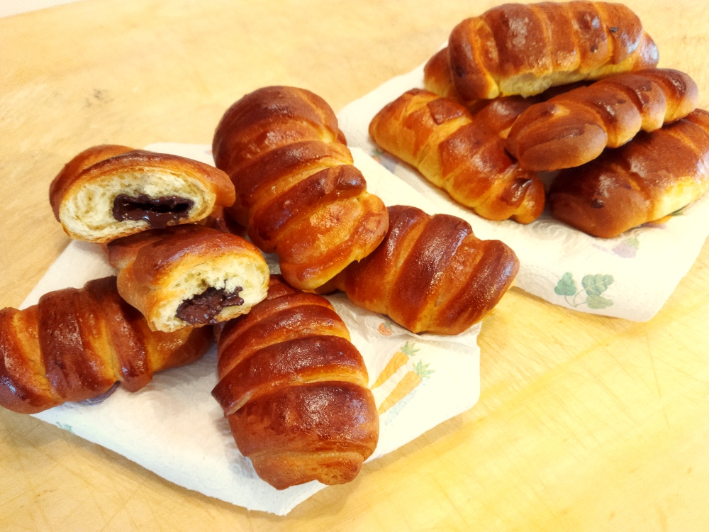 Clara ha scritto:in piccole brioches farcite di cioccolato, tipo pain au chocolat, buone, non molto dolci ma