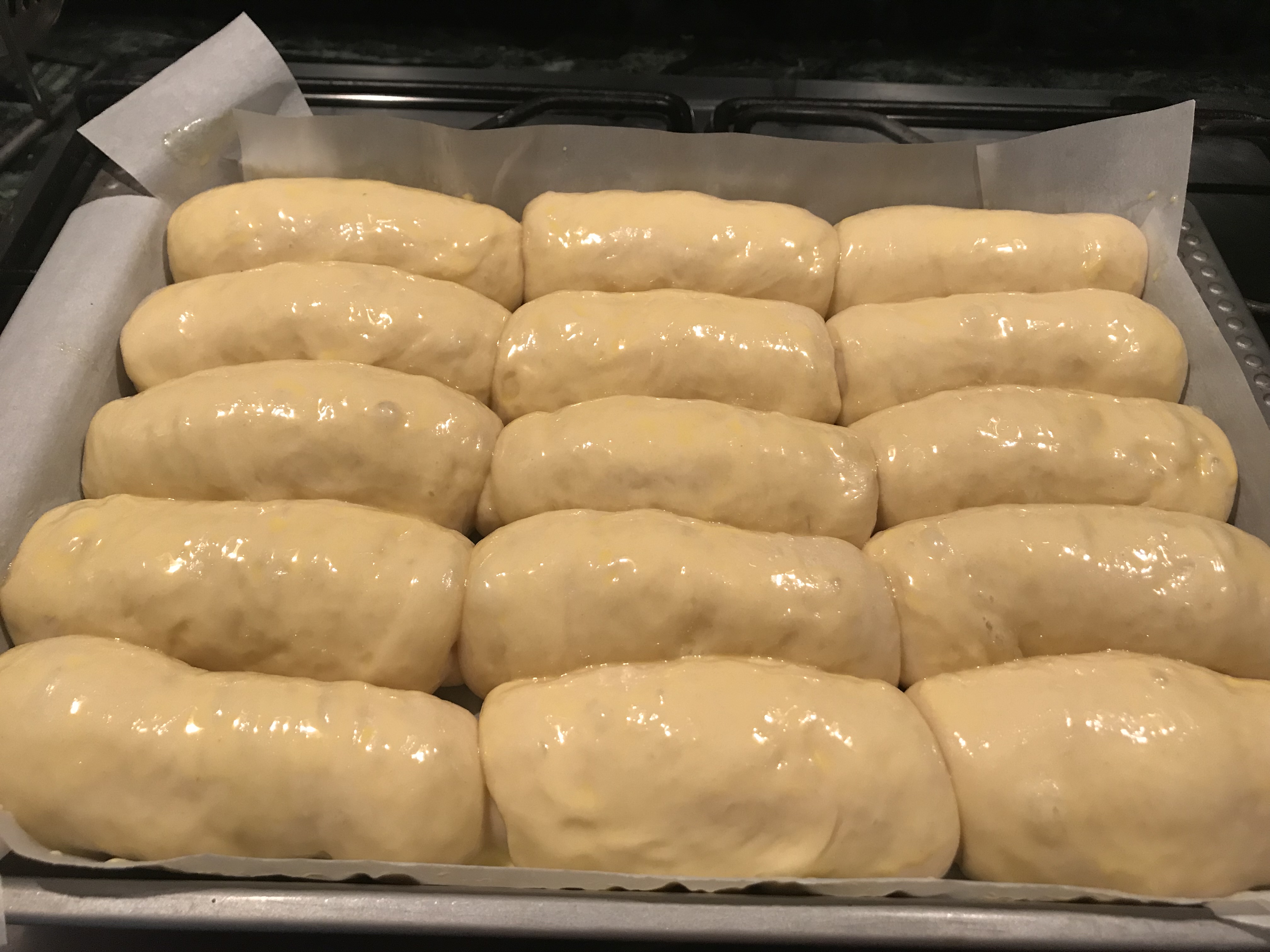 Li dispongo su teglia rettangolare, distanziati, e aspetto che lievitino. Inforno a 170–175°C per 15 minuti.