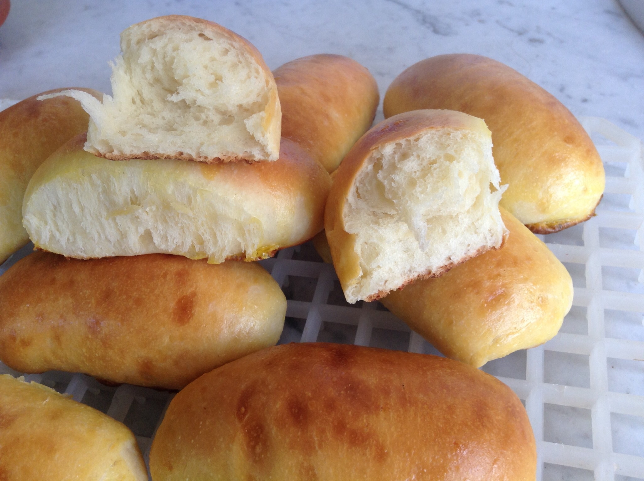 - Spezzare in 12 pezzi da circa 65 g, stendere ogni pezzo col mattarello e arrotolarlo dal lato corto.