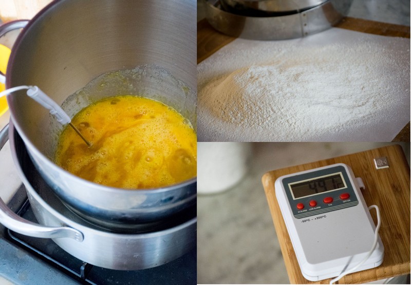 In una planetaria, (ma può farsi anche con il semplice sbattitore), montare uova e zucchero lavorando a media velocità (3 sul Kenwood, per esempio). Setacciare la farina due volte e incorporarla poco alla volta, (in tre volte è ottimale) amalgamando sempre dal basso verso l’alto e senza mescolare troppo, per non creare un glutine troppo forte. Stesso procedimento per cottura e stampi struttura più compatta e cremosa,