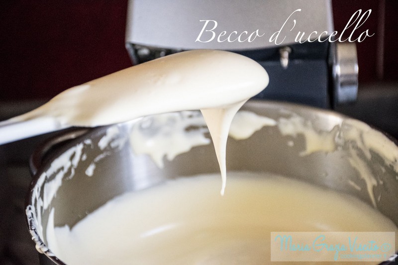 La massa è montata quando la frusta lascia solchi e tracce ben visibili in superficie. Per verificare la corretta montatura, se si immerge la spatola nella massa e la si mette in posizione verticale, si forma una punta leggermente allungata e curva, detta anche a “becco di uccello”