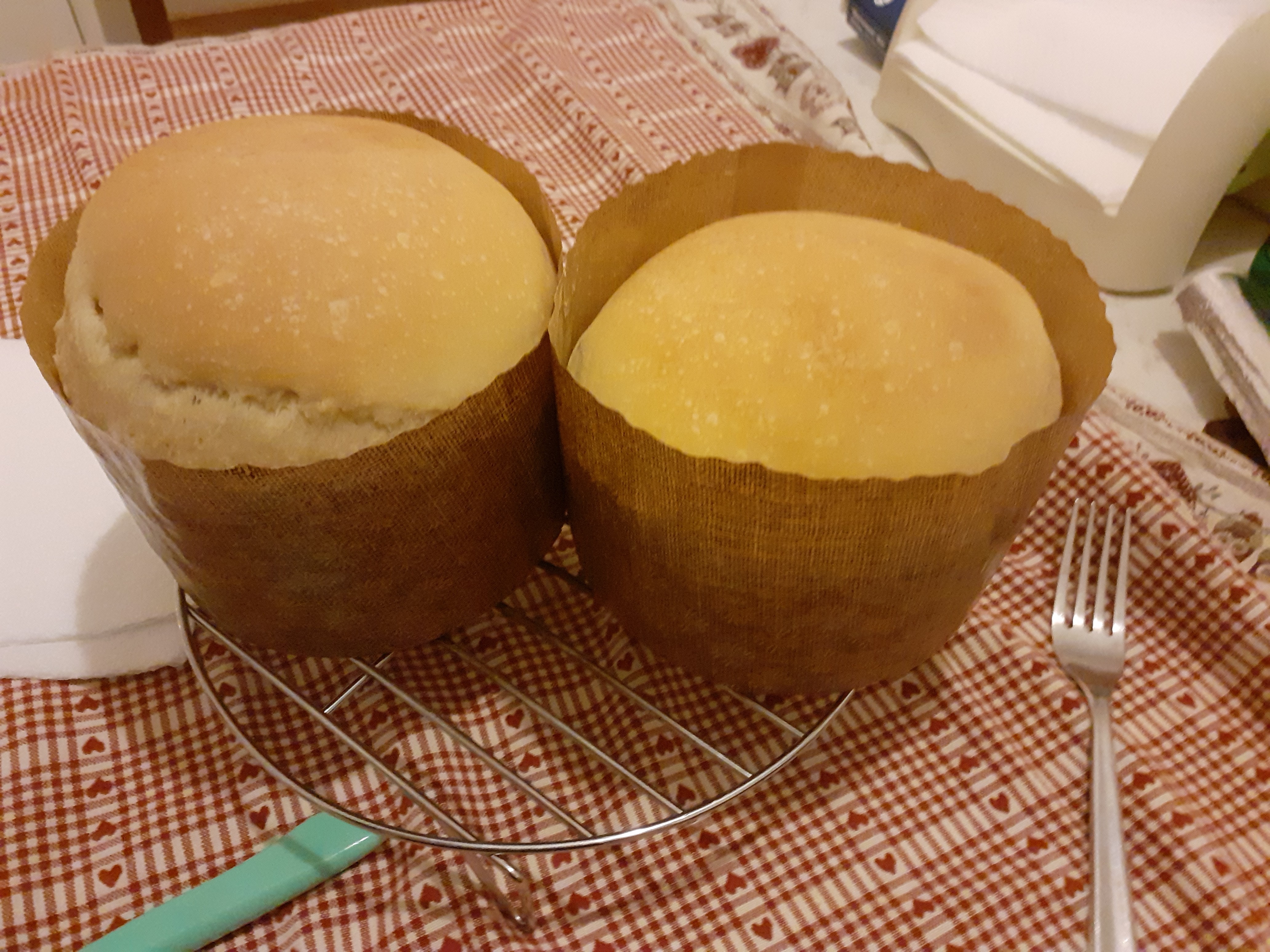 Con l’impasto lievitato, creiamo due pagnotte ripiegando i lembi esterni verso l’interno. Inseriamo le due pagnotte in due stampi da panettonere ben oleati. Copriamo e lasciamo lievitare ancora fino al raddoppio (circa 2 ore): deve crearsi la tipica cupola. Cuociamo in forno caldo e statico a 240° per 40 minuti.
