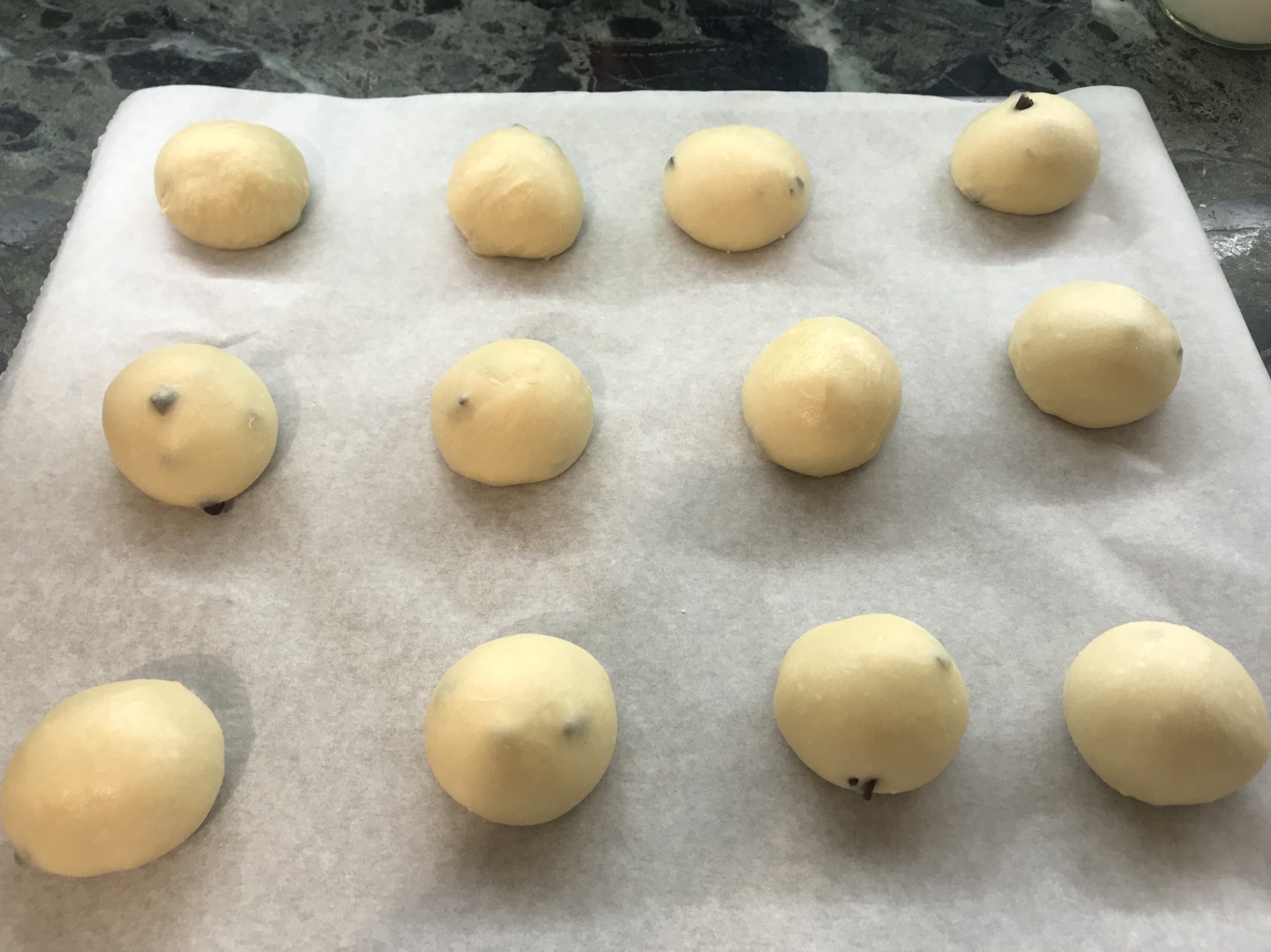 Formare i pangoccioli, metterli a lievitare coperti in forno spento con luce accesa per circa 4h.