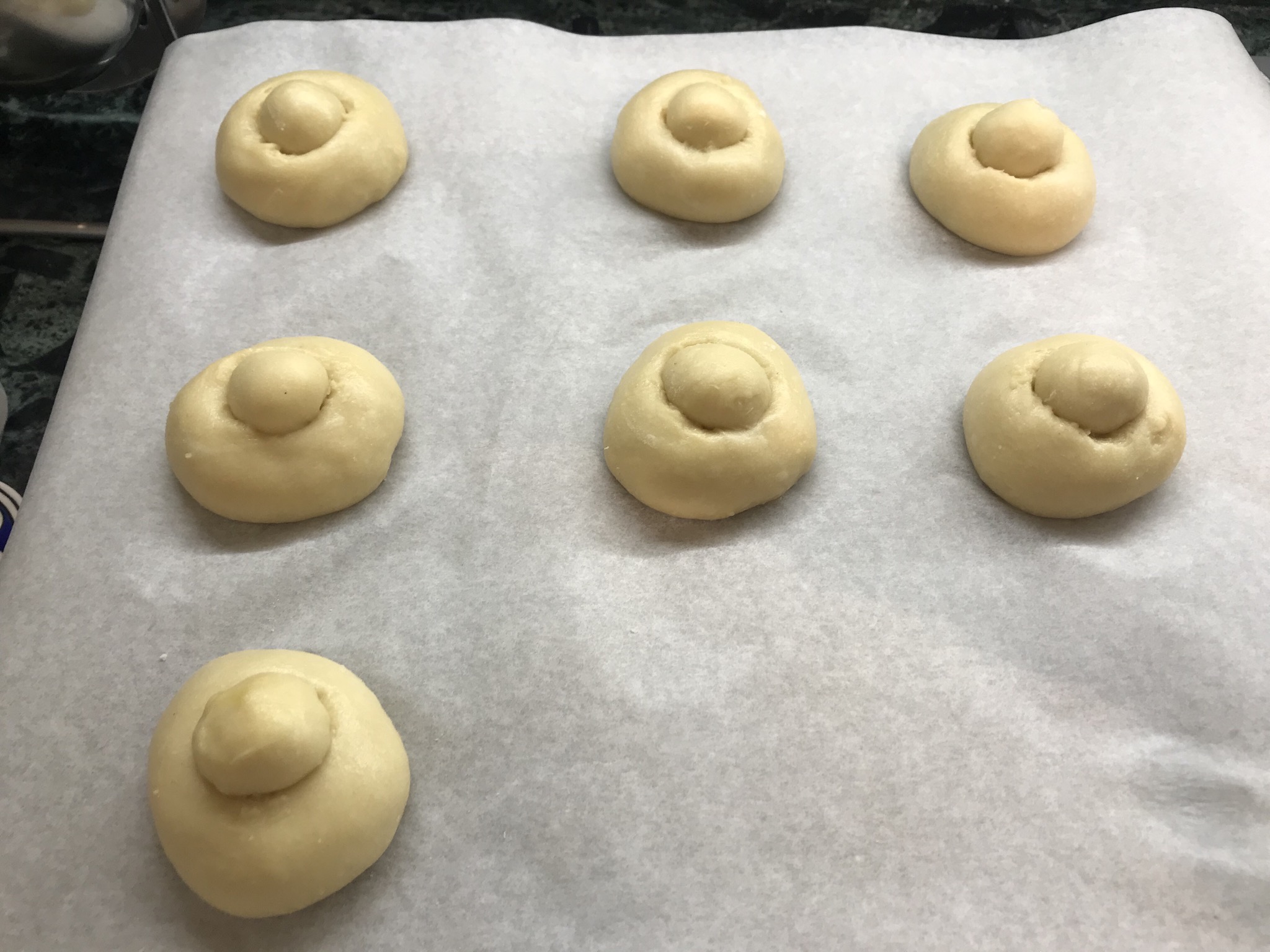 Mettere a lievitare in una teglia coperta da carta forno, pennellare con tuorlo e latte, coprire con pellicola e attendere il raddoppio. 1 h circa.
