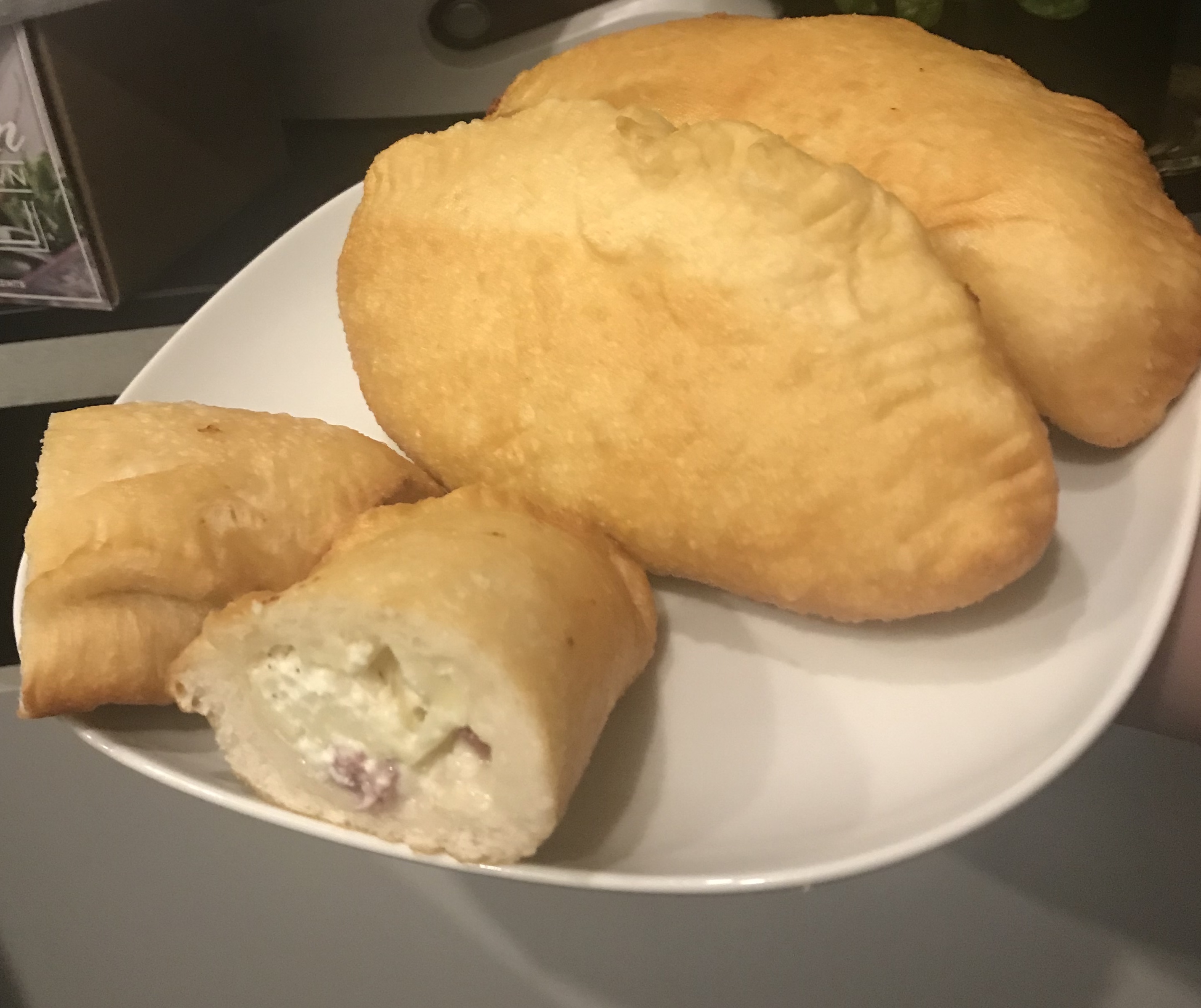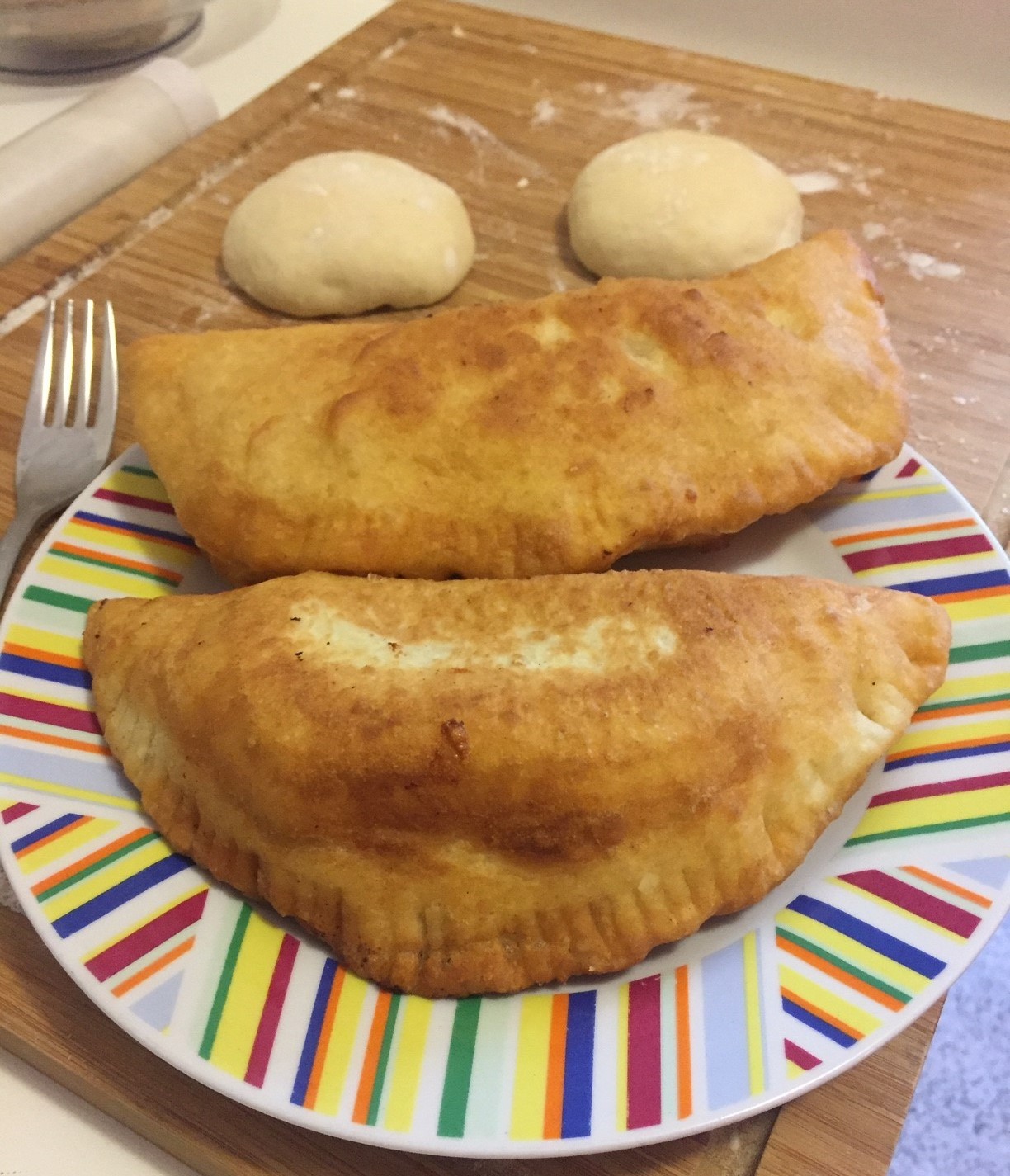 Procedimento: 1. Mescolare acqua, latte, lievito e zucchero. Far riposare 5 minuti. Nel frattempo setacciare la farina e i fiocchi di patate in una ciotola. 2. Versare i liquidi col lievito pian piano (non tutti assieme) e dare una prima impastata. Aggiungere il tuorlo e impastare bene fino a che si è assorbito. 3. A questo punto aggiungere il sale, e impastare ancora, infine lo strutto. Si può fare sia a mano che con la planetaria, tutto l'impastamento dovrà durare 15 minuti. Tutti gli ingredienti dovranno essere ben amalgamati e l'impasto dovrà presentarsi ben legato, molto morbido ma maneggevole e non dovrà attaccarsi alla spianatoia. 4. Porre in una ciotola, coprire con pellicola e far lievitare 1 ora e 1/2. 5. Nel frattempo sminuzzare finemente mortadella e provola e amalgamare bene il tutto. 6. Quindi, stendere col mattarello due lunghi rettangoli di pasta dello spessore di 4/5 mm. In uno di questi mettere delle polpettine di ripieno da circa 30 gr abbondanti l'una, (per la distanza tenere conto della misura del coppa pasta, 8 cm. di diametro.) 7. Pennellare con albume d'uovo sbattuto tutto intorno e poggiare sopra l'altro rettangolo di pasta. Premere bene con le dita per far aderire bene l'impasto, facendo in modo che attorno al ripieno non ci sia aria, altrimenti in cottura si gonfieranno come delle enormi bombe! 8. Tagliare poi i panzerotti con un coppa pasta di 8 cm. di diametro. Premere ancora tutto attorno con le dita per fissare bene e togliere aria se ce n'è ancora. 9. Far riposare i calzoni coperti da un telo per circa 1 ora max 1 ora e 1/2. 10. I ritagli di pasta vanno impastati di nuovo, si attende 10 minuti che l'impasto si stenda bene e si ripete tutta l'operazione. 11. Dopo la lievitazione, friggere in olio caldo a 170° girando non appena da un lato saranno dorati, scolare su carta assorbente e mangiare ben caldi!
