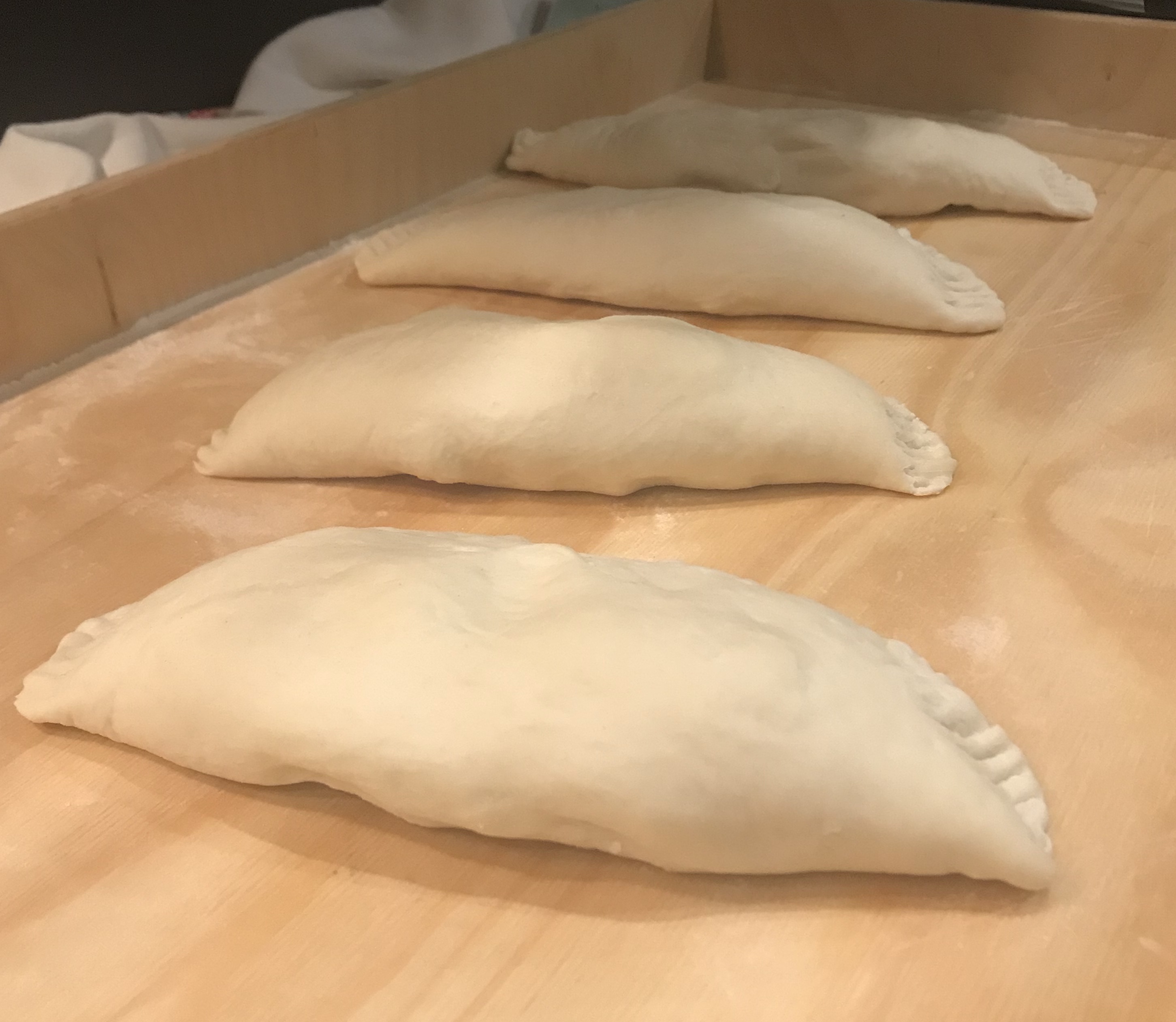 Al raddoppio della massa, ho spezzato in porzioni da 100gr per le pizzette fritte e in porzioni da 140gr per i calzoni. Formato i panielli e fatti raddoppiare sulla spianatoia coperti con un canovaccio.