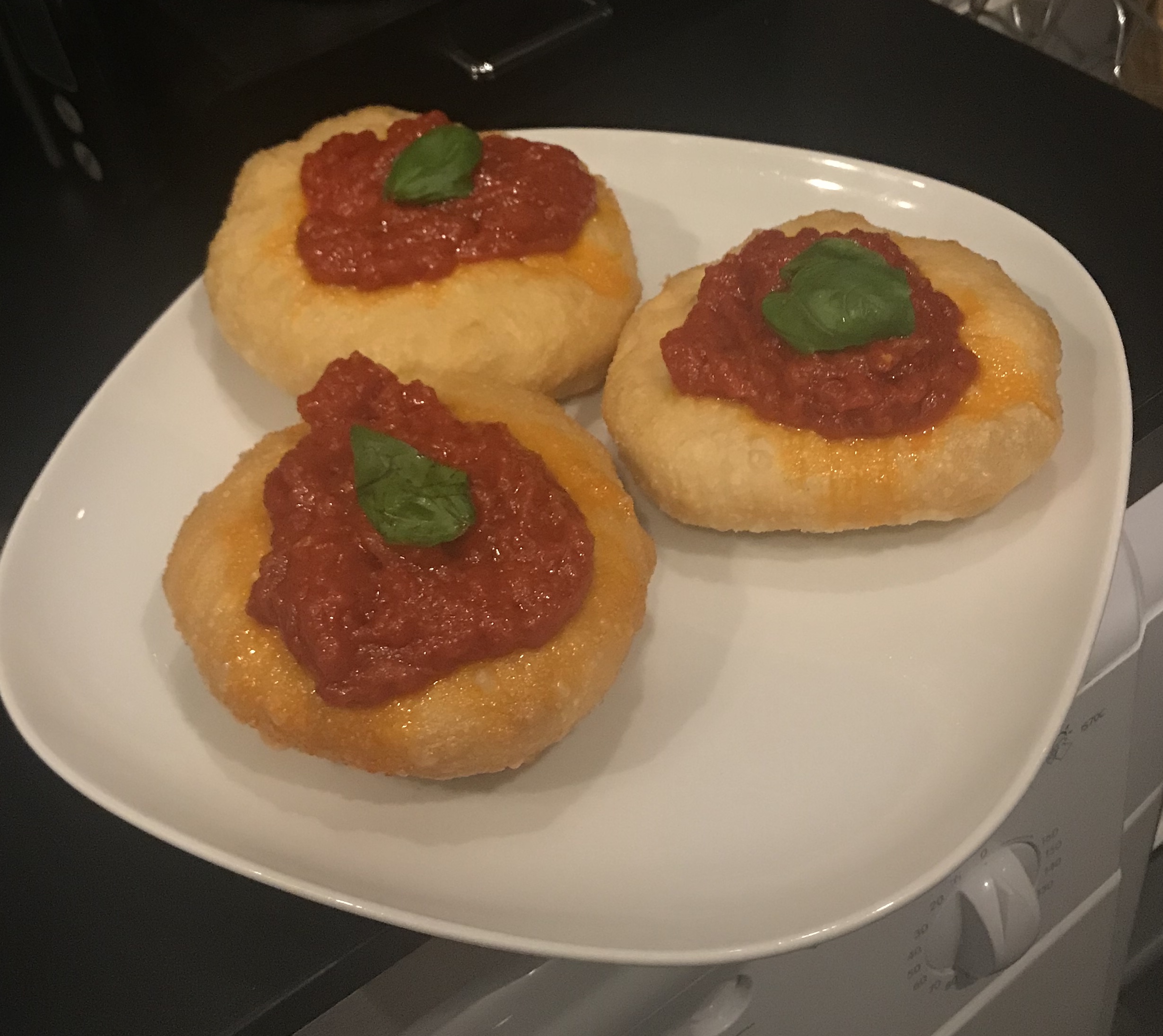 prima lievitazione nella ciotola x 2-3 ore, poi fatto pezzatura di 80 gr. e fatto riposare 30 minuti, poi stesi con matterello