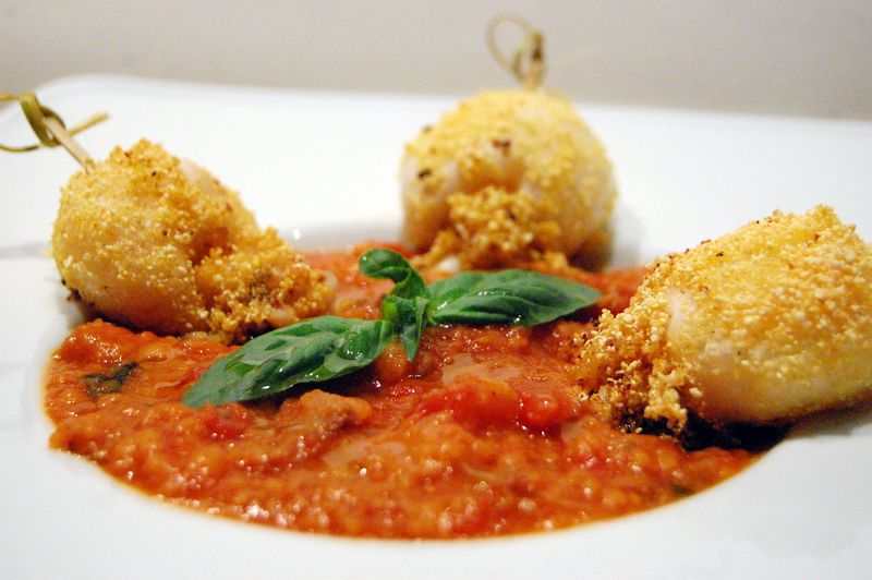 spiedini, per creare un contrasto di temperature e consistenze diverse (fredda e morbida la zuppa, calde e