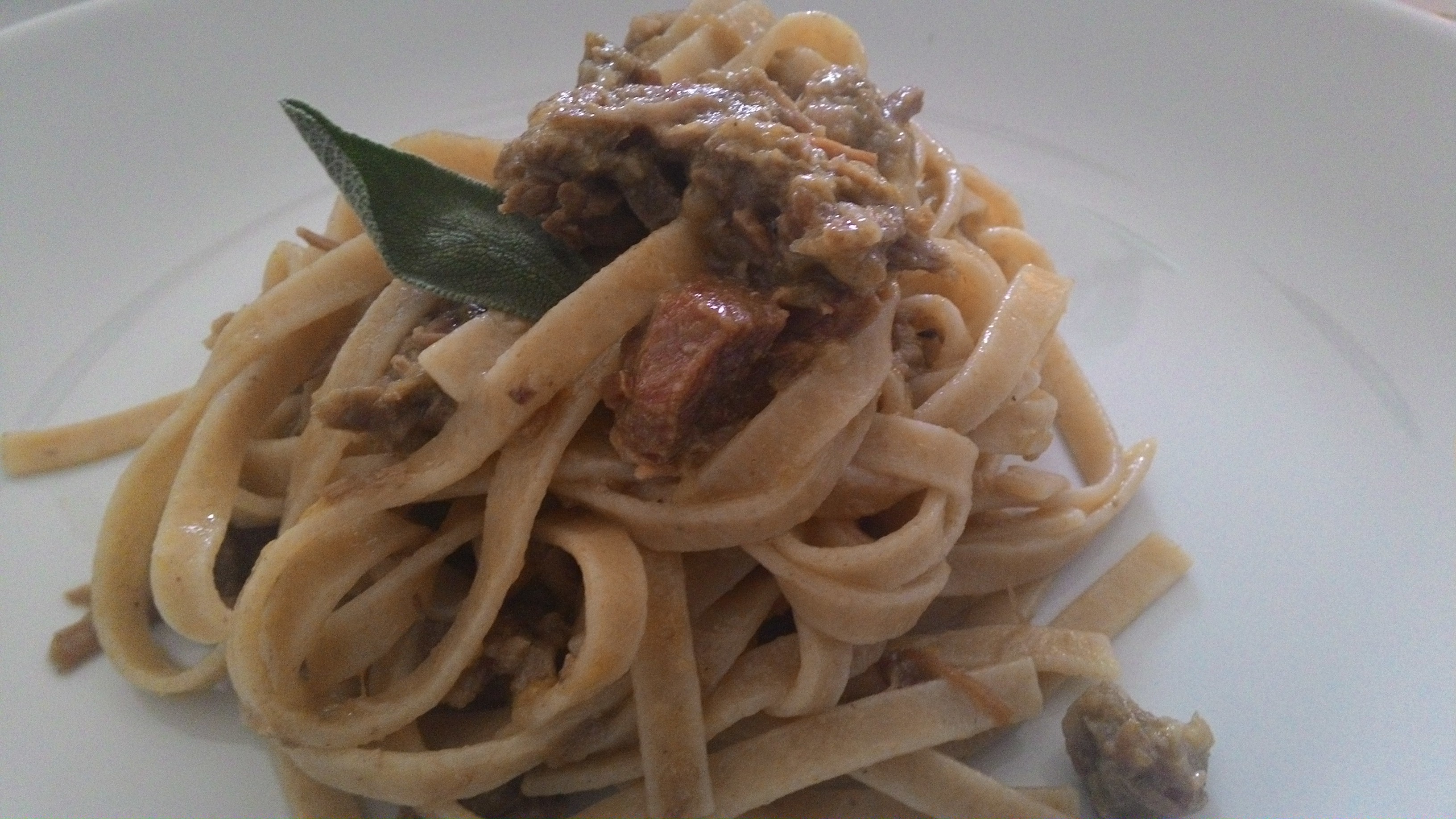 Giunti a fine cottura, scolate le pappardelle al dente, saltatele velocemente nel sughetto, spolverate di pepe nero, salvia, tartufo bianco e grana padano.