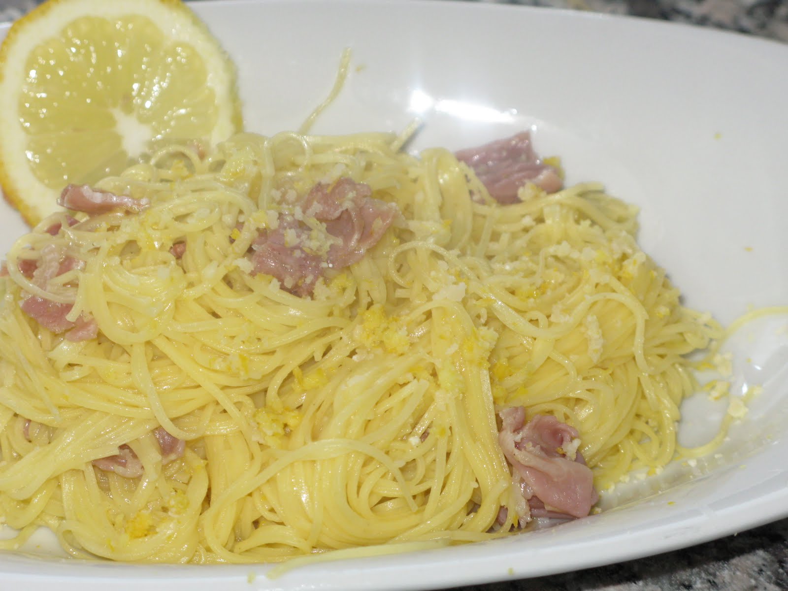 Un primo piatto fresco e profumato, senza panna: pasta di Campofilone con scorza di limone, prosciutto crudo e parmigiano.