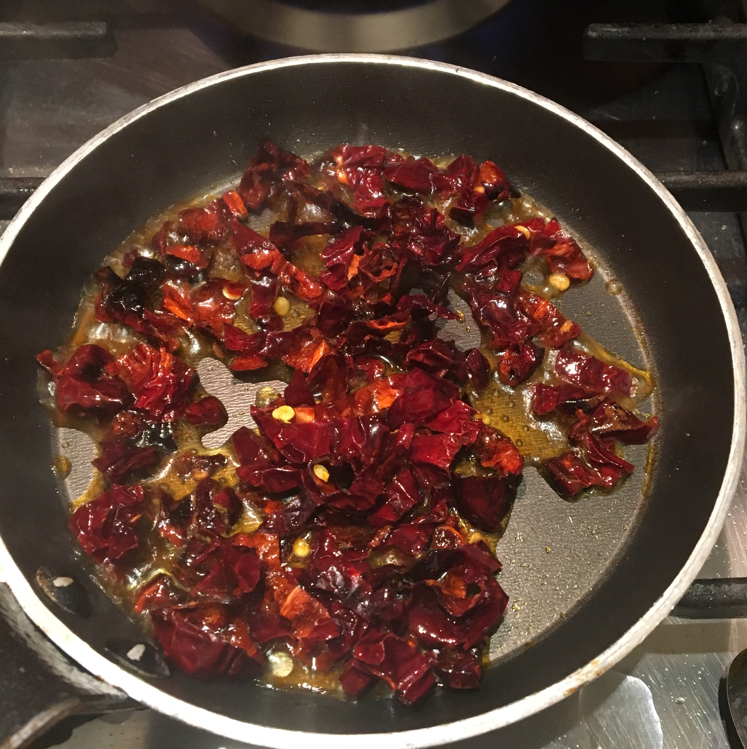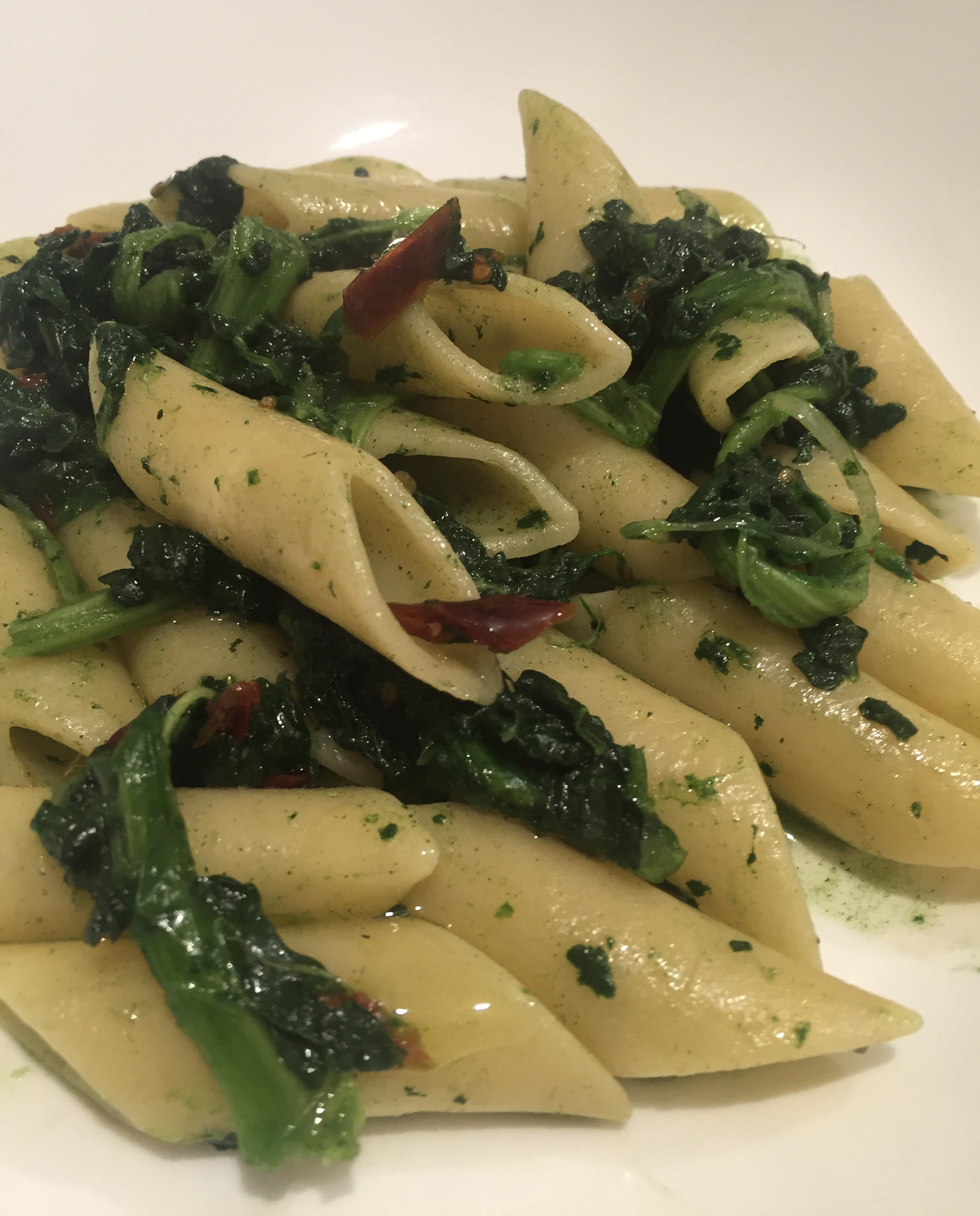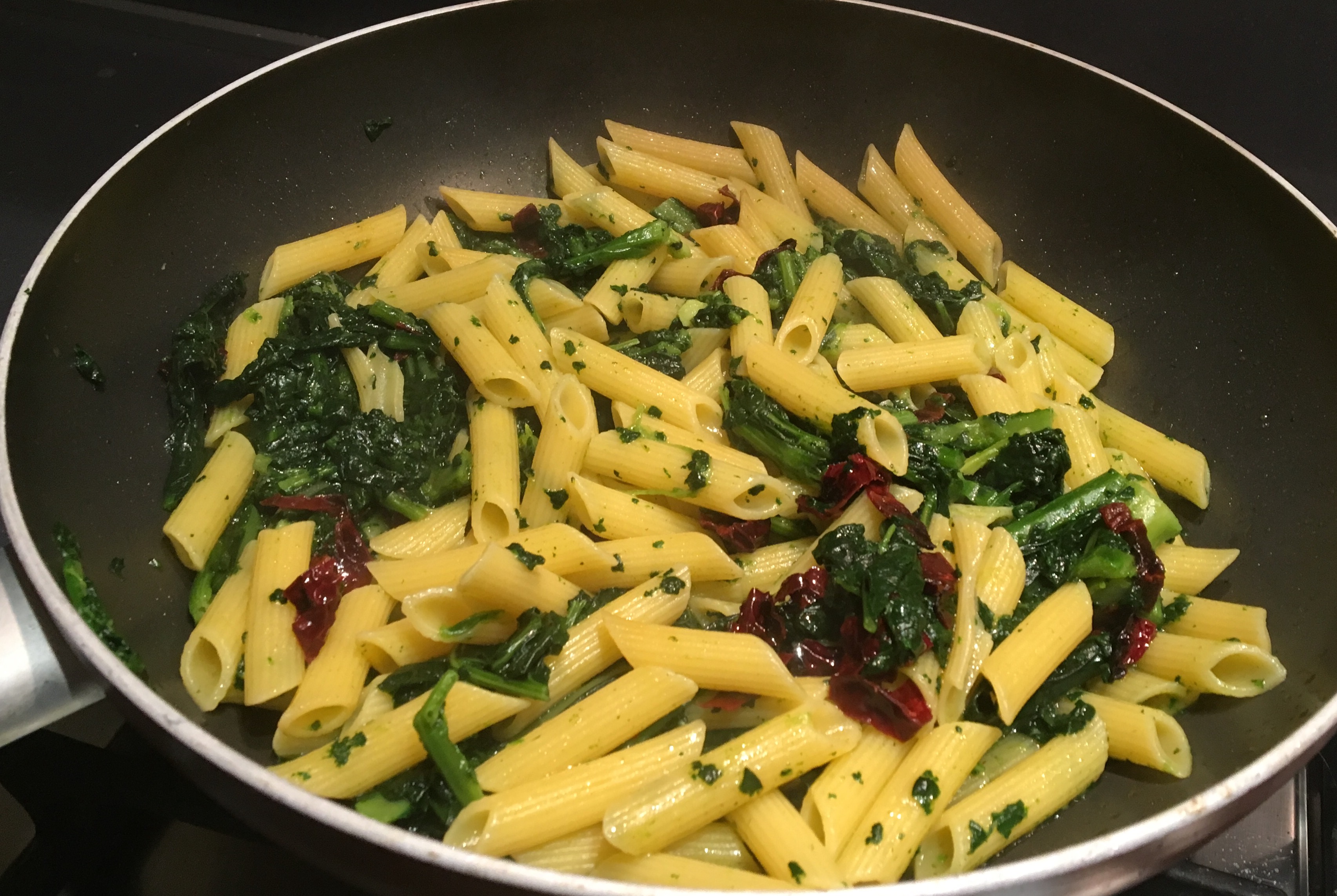 Ho aggiunto la pasta; di solito uso le caserecce ma in questo periodo uso la pasta per celiaci quindi per noi penne. Intanto ho rosolato in padella due spicchi d'aglio in olio d'oliva. Ho tagliato a striscioline il peperone crusco e l'ho rosolato leggermente in un padellino con poco olio d'oliva e ho aggiunto mezza tazzina da caffè per ammorbidirlo; ho spento quasi immediatamente. Ho scolato pasta e cavoli lasciandola un pó umida e ho ripassato in padella aggiungendo il peperone.