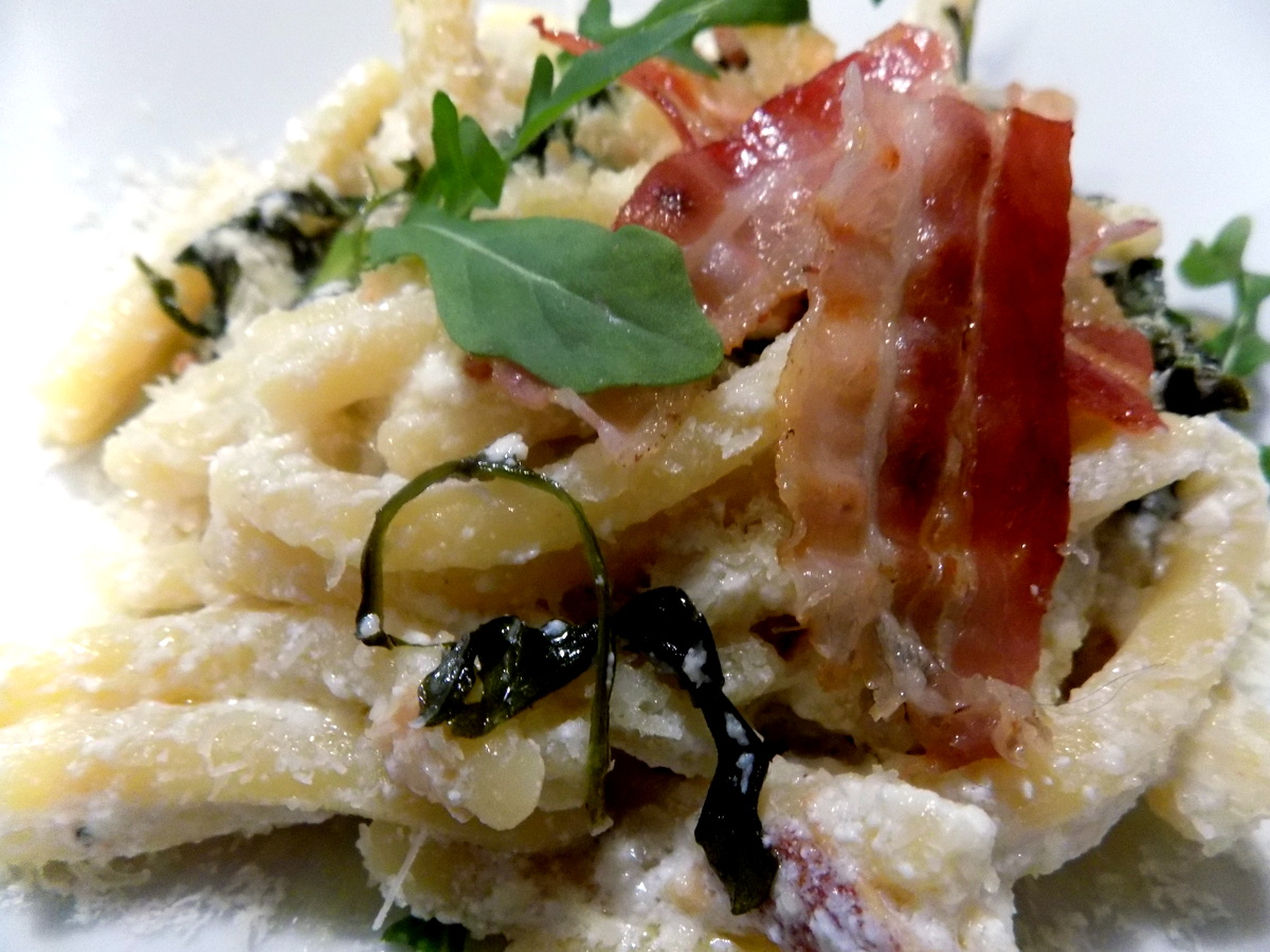 Mentre cucinava la pasta, ho aggiunto alla ricotta un mestolino di acqua di pasta e il suo siero ed ho spolverato di pepe. Con l'aiuto di una forchetta ho diluito la ricotta. Togliere la pasta al dente e rigirare la ricotta, aggiungere pancetta e rughetta già cotti e spolverata di canestrato finale e ancora pepe.