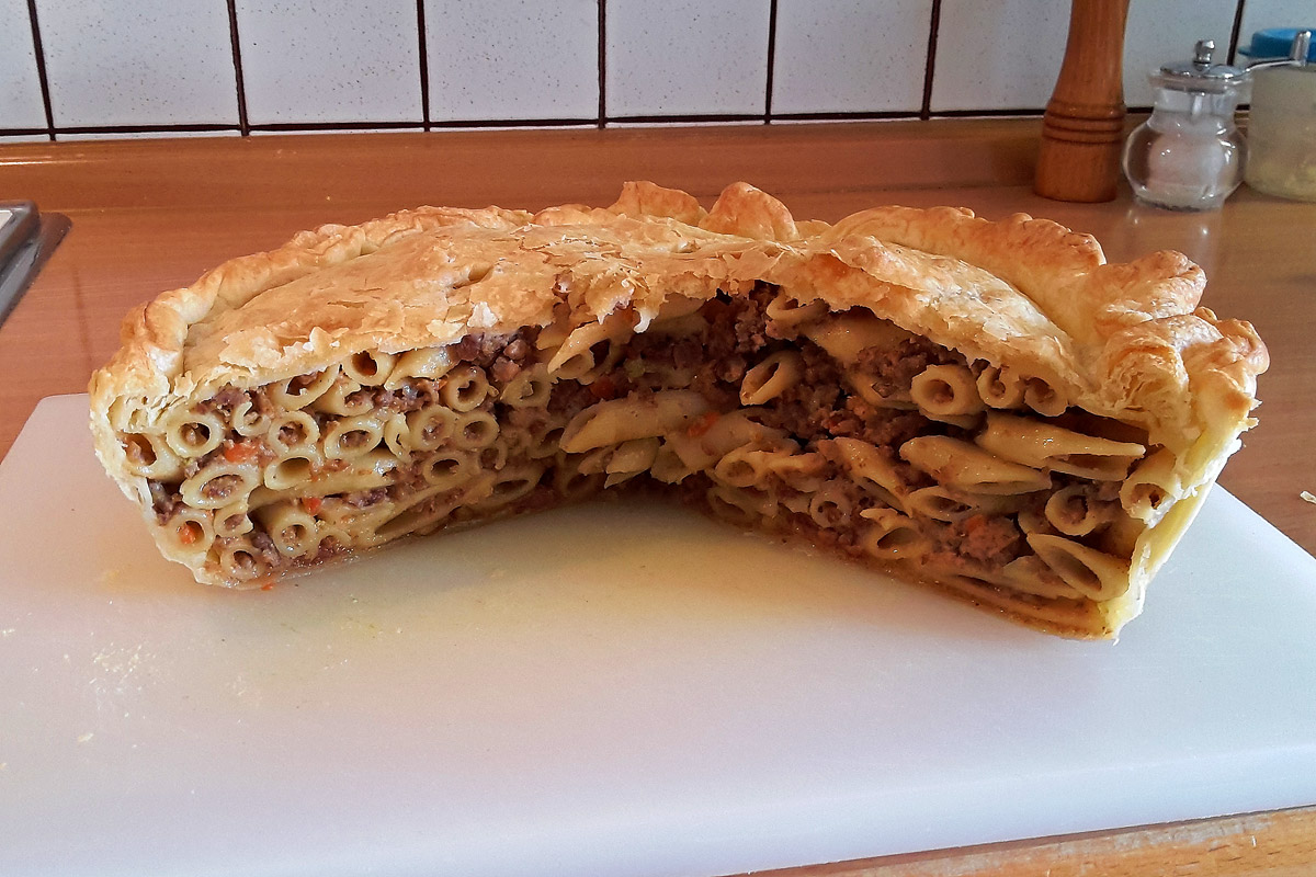 "Io ho sbagliato perché avrei dovuto riempire di più la tortiera, formando così una cupoletta e dando al pasticcio la forma tradizionale, inoltre per ottenere un bell'effetto si dovrebbe lucidare la pasta con l'uovo, ma ho evitato perché mi era risultata una frolla già abbastanza ovosa. La consistenza andava bene, appena morbida e friabile; peccato però che il mio pasticcio sia risultato un poco troppo asciutto perché è rimasto in forno alcuni minuti di troppo!!!"