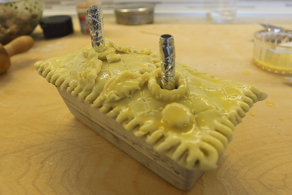 Coprire con un coperchio di pasta , sigillando bene e fare due fori sulla stessa inserendo due caminetti fatti con alluminio alimentare che serviranno a far uscire il vapore durante la cottura.