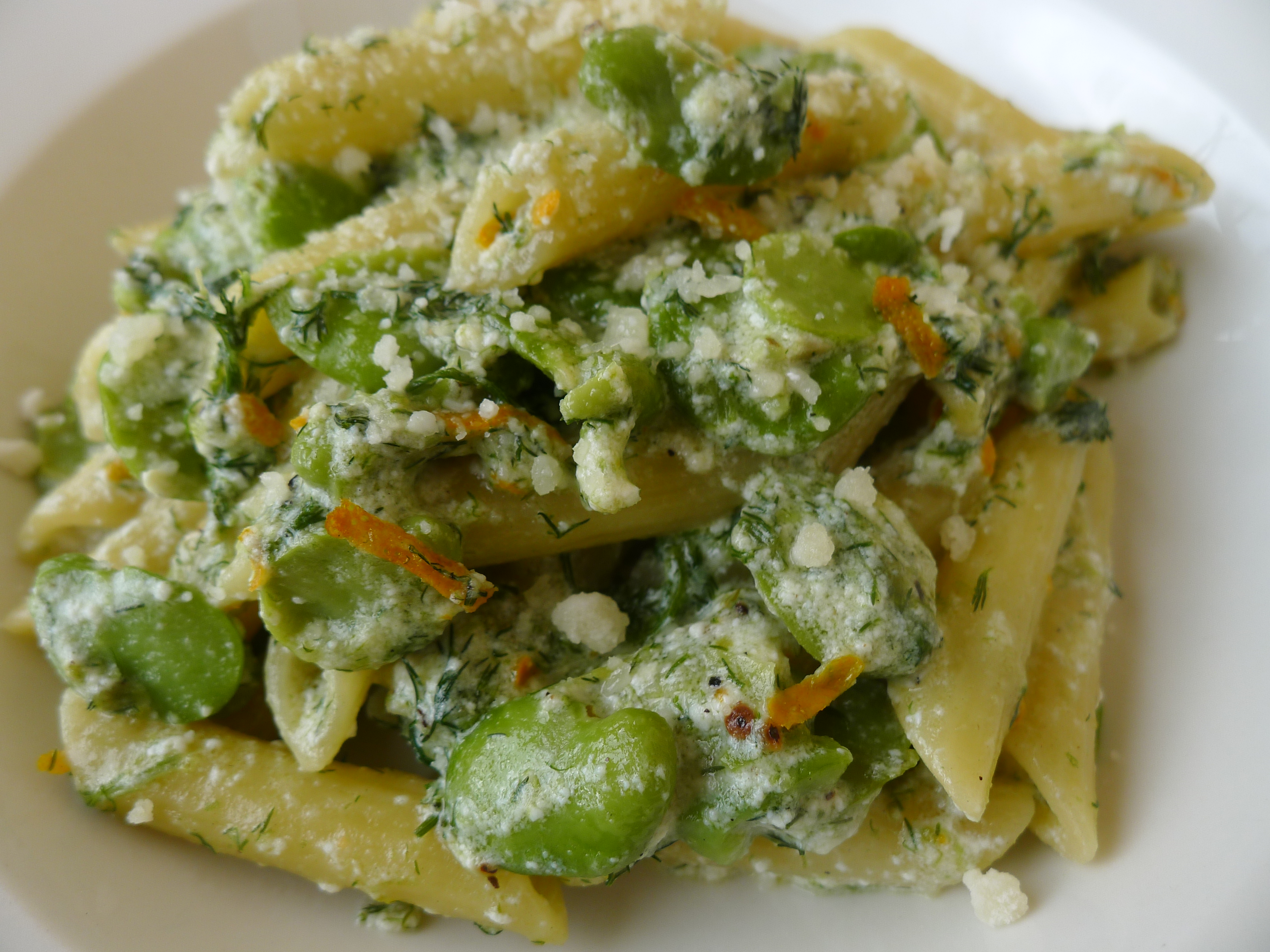Si sbucciano le fave e si toglie la pellicina. Pulire il finocchietto, eliminando le parti più dure, e tritare. Tritare anche la cipollina e fare appasire con 3 cucchiai di acqua e 2 di olio, aggiungere il finocchietto e una punta di dado vegetale. Coprire e fare cuocere. Aggiungere le favette e coprire nuovamente dopo avere inserito anche la scorza dell'arancia tagliata a fili o grattugiata. Nel frattempo cuocere la pasta. Usare un pò di acqua di cottura della pasta per diluire la ricotta, a cui si aggiunge un cucchiaio di parmiggiano grattugiato e pepe macinato grosso, battendo con i rebbi della forchetta. Dovrà avere la consistenza di una besciamella.