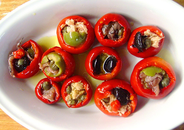 Inserisco un cappero in ogni oliva, la contorno con il filetto di acciuga e la inserisco nel peperoncino. Se piccolo piccolo, taglio l'oliva in orizzontale a metà, se i peperoncini sono grandi, metto un pezzetto di acciuga sul fondo prima di inserire l'oliva.