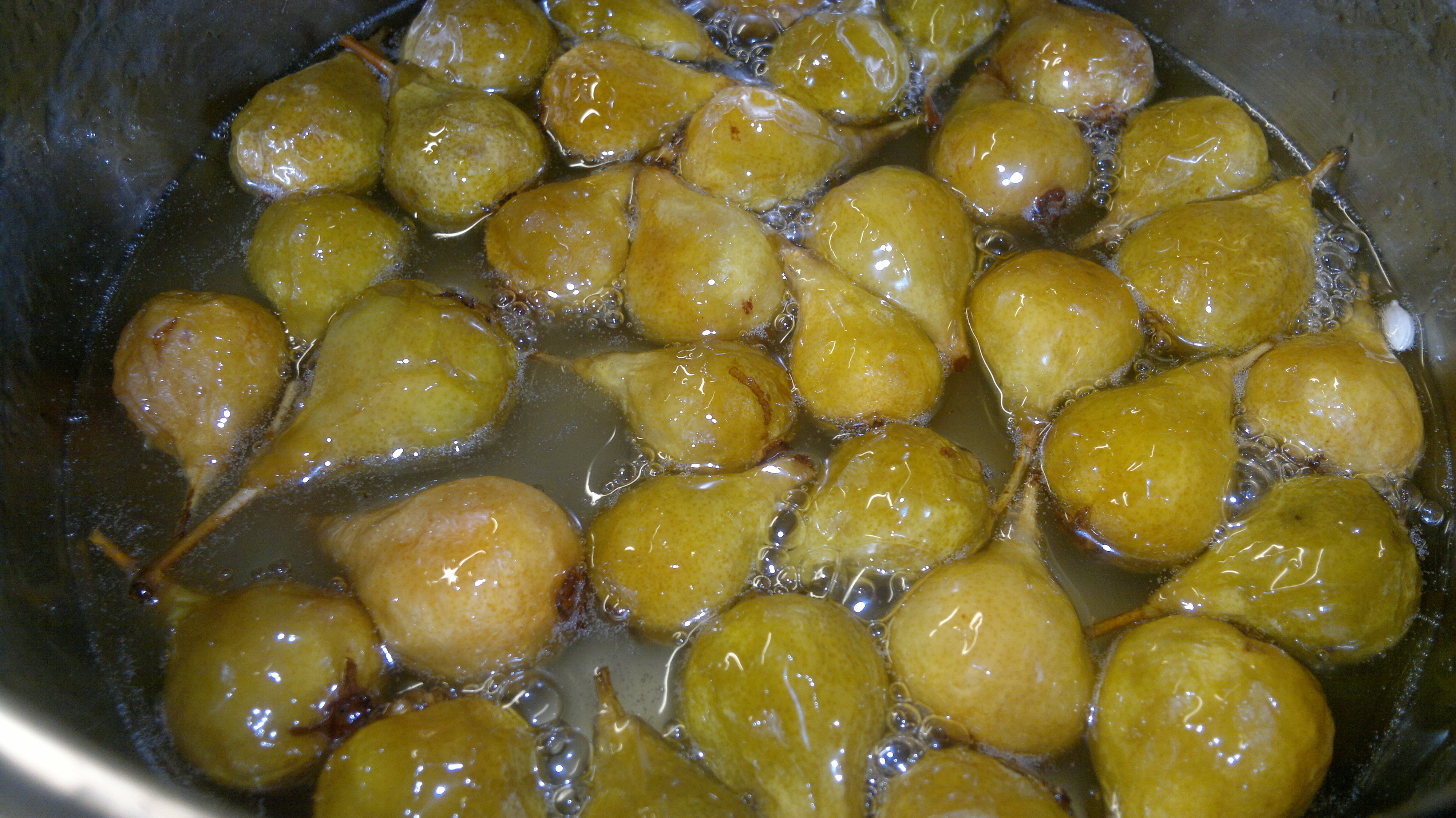 - Quando lo zucchero sarà sciolto e inizierà a bollire, aggiungete le pere e i cornioli interi.