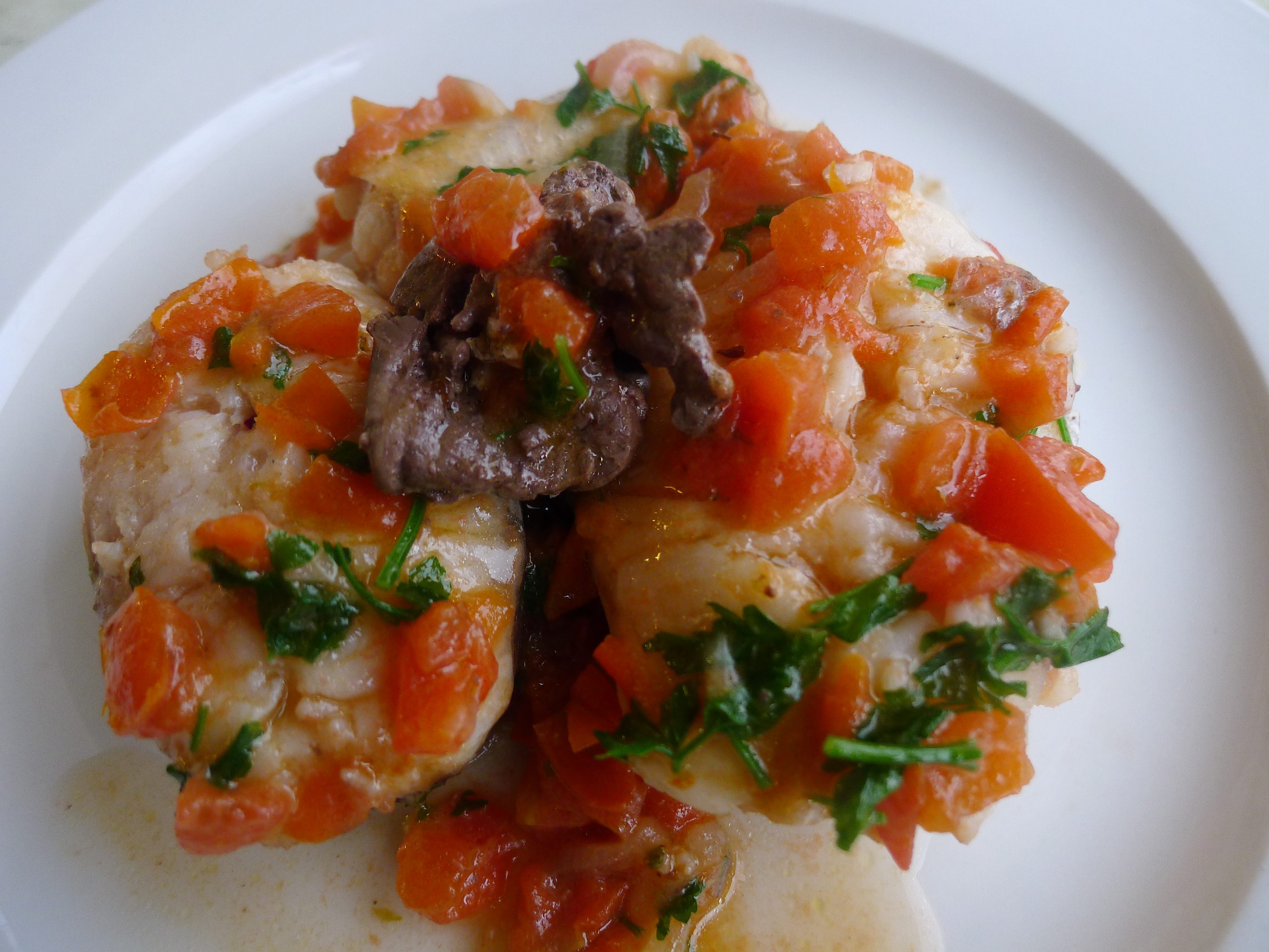 Una volta acquistati Nasello (poi eviscerato e lavato) o trance di Grongo sufficienti per il numero dei commensali, si prepara una larga padella antiaderente con abbondante olio extravergine di oliva (possibilmente quello ligure, leggero e non invadente di sapore), uno spicchio di aglio intero, rondelle sottili di cipollotto (anche la cipolla tagliata in fini sfoglie potrebbe andar bene), pomodori tagliuzzati minuscoli a coltello, un ciuffo di prezzemolo tagliuzzato grossolanamente con le forbici o con le dita e un pizzico di origano.