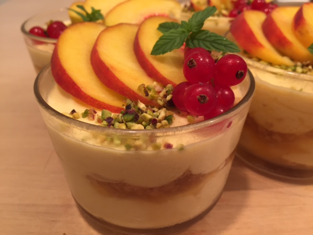Alla fine, per completare, lavate e asciugate una bella pesca sana, affettatela sottilmente lasciando la buccia e aggiungete le fette al dolce di pesche, colorate il tutto con un rametto di ribes rosso e un ciuffetto di menta fresca.