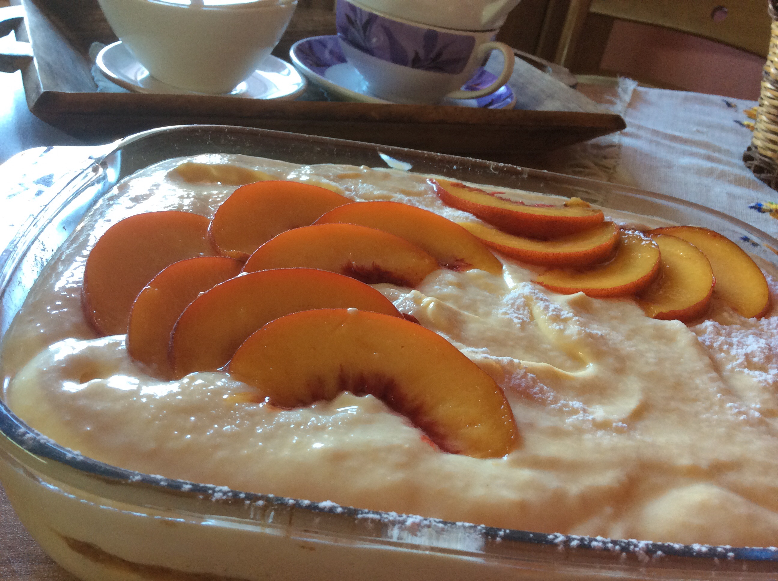 Bagnate gli amaretti dentro al succo di pesche, lasciateli un po' inzuppare, e fatene uno strato, anche spezzandoli, sul fondo dei bicchieri o delle coppe, ricopriteli con un poco di crema alle pesche, fate un altro strato di amaretti sempre prima bagnandoli nel succo e terminate con un ultrimo strato di crema.