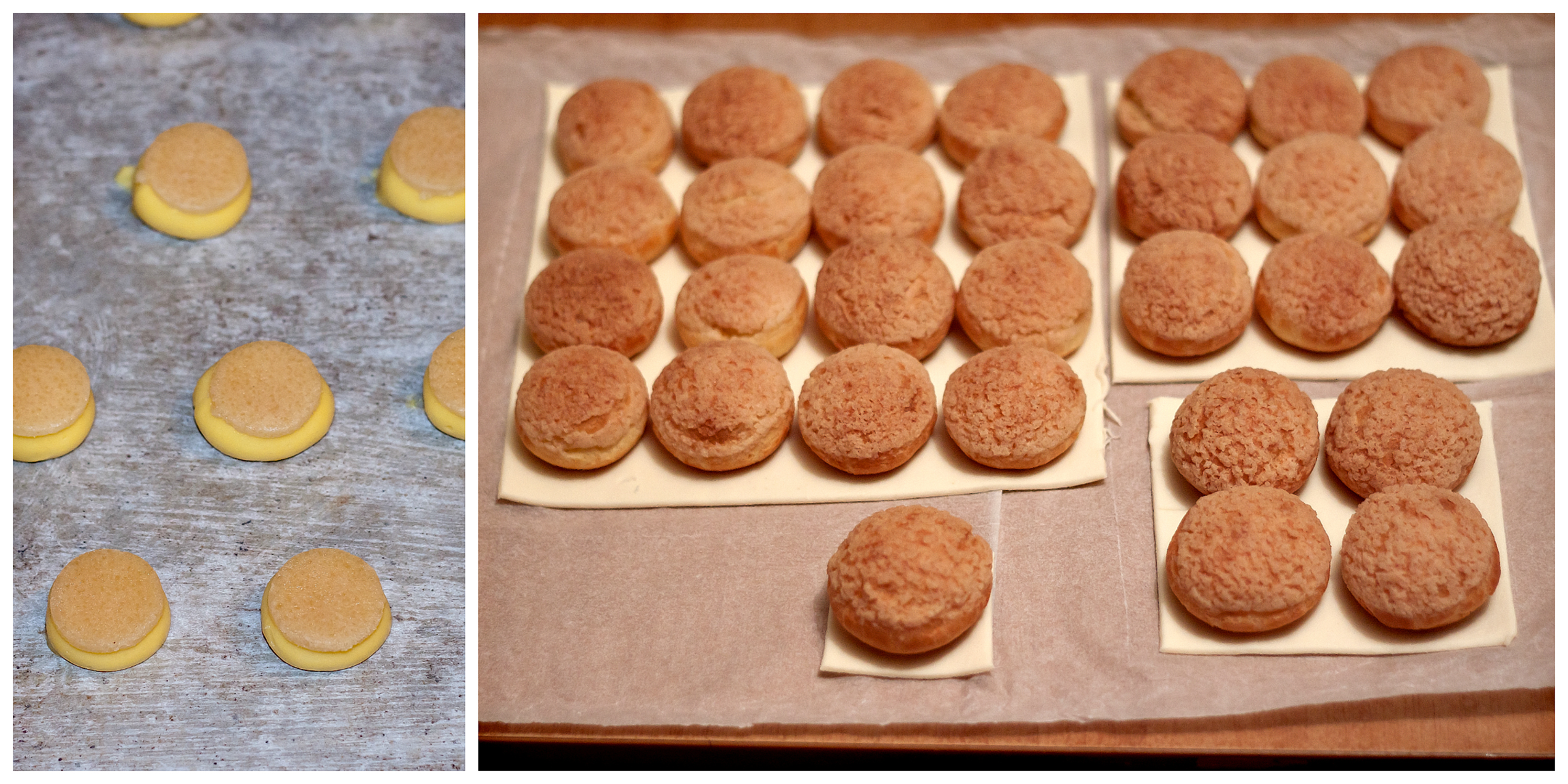 Posizionate un dischetto su ogni bignè premendo delicatamente e trasferite la teglia in forno già caldo a 200° per 10 minuti, abbassate la temperatura a 180° e proseguite la cottura fino a doratura. A cottura ultimata, lasciate raffreddare con il forno in fessura.