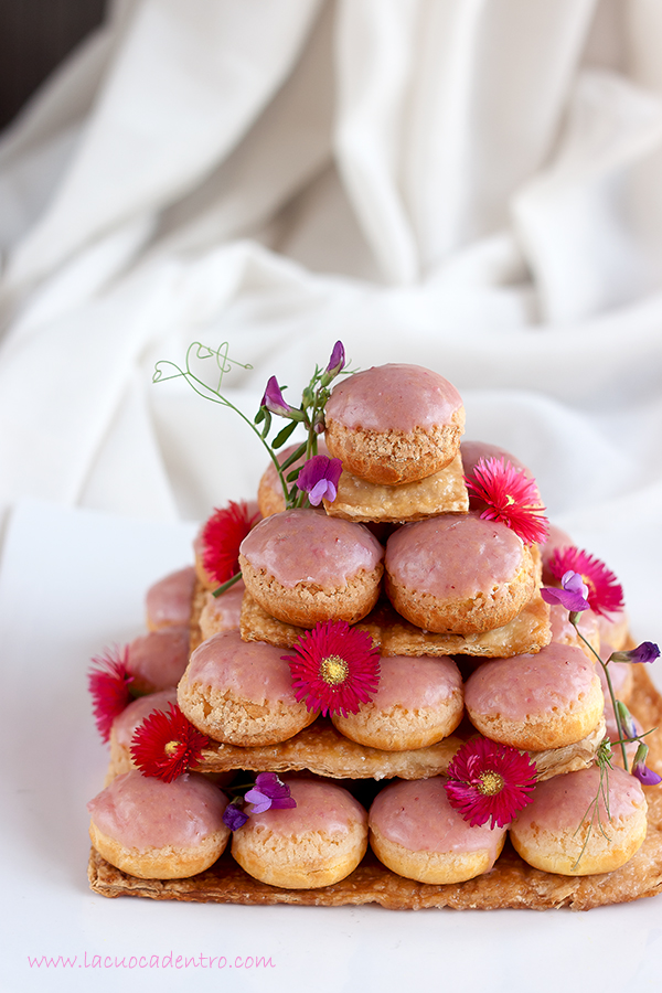 Componete la piramide di bignè e pasta sfoglia come in foto, decorate a piacere con fiori freschi o fiori di zucchero.