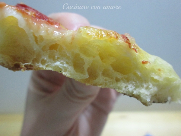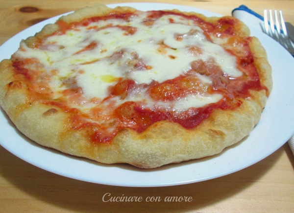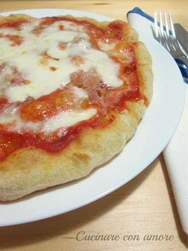 Se invece volete una pizza più alta, in teglia, far acclimatare l’impasto per 3 ore. Capovolgere l’impasto in una teglia oleata e stendere l’impasto partendo dal centro verso l’esterno delicatamente e far lievitare nel forno spento con la luce accesa per 2 ore. Cuocere in forno preriscaldato statico nella parte inferiore a 200° per 20 minuti condendola solo con salsa, un pò di sale e pepe. Aggiungere la mozzarella e il prosciutto cotto, e far continuare a cuocere nella parte media del forno a 200° per 5-10 minuti.