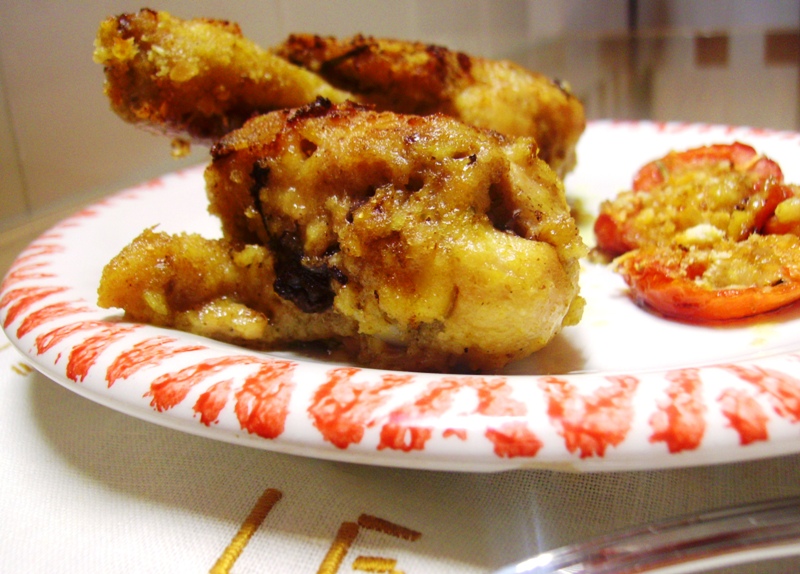 Fiammeggio dei quarti di pollo (cosce+retro) e li sciacquo sotto l'acqua corrente, lascio scolare brevemente e impano abbondantemente col mix preparato. Appoggio sulla placca da forno ricoperta di carta forno.Cuoccio in forno a 200° per un 'ora comunque finchè si forma una bella crosta leggermente abbrustolita ( la pelliccia appunto)