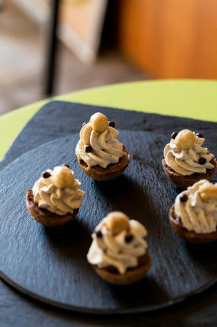 Come primo dolce ho provato queste tartellette particolari. me ne ero innamorata a prima vista anche per l'aspetto, lo confesso: la base è una semisfera di pate sucree al cioccolato (a semisfera non ci avrei mai pensato!!), con una crema al cioccolato e caffe e una chantilly al caffe.