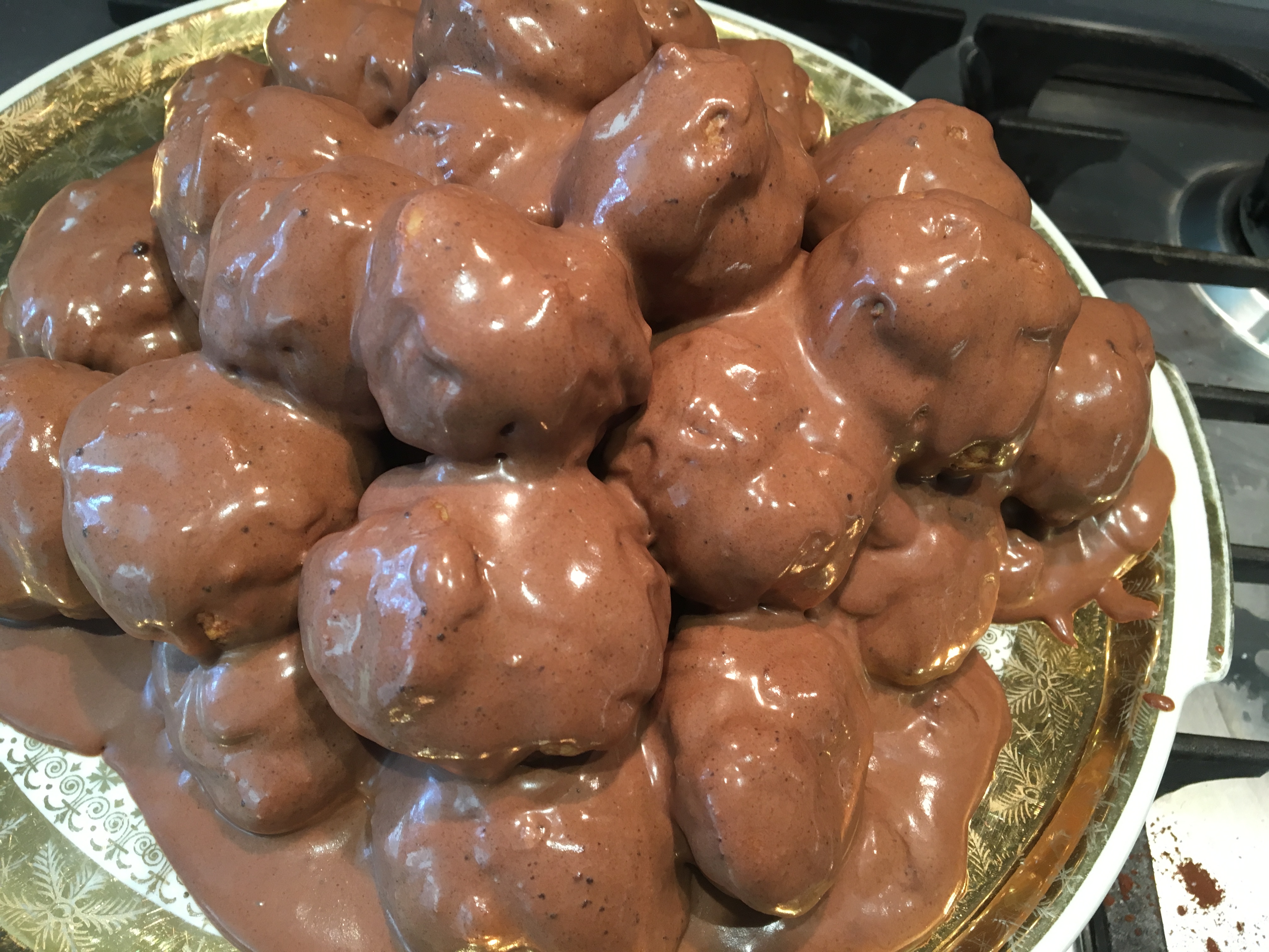 Prendere i bignè e tuffarli nella salsa al cioccolato. Disporli in un vassoio e lasciarli riposare in frigo fino al momento dell’utilizzo.
