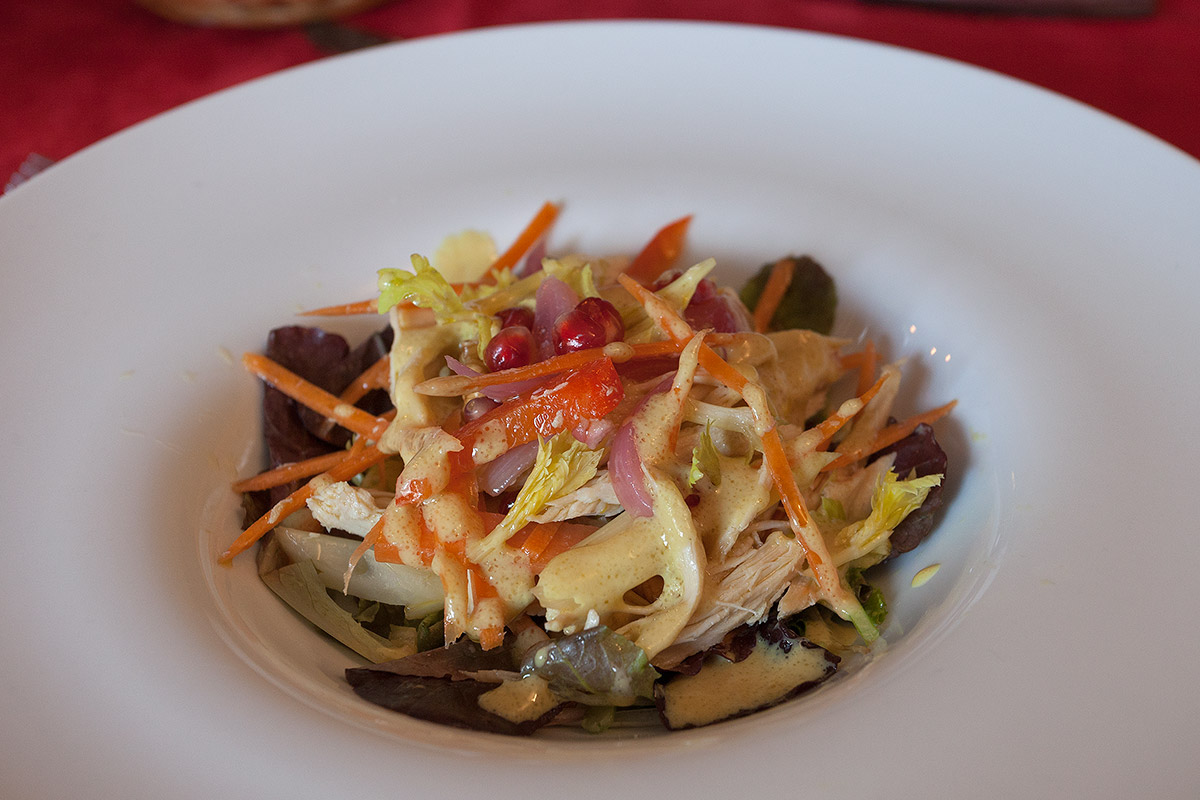 Dopo averlo cotto, l'ho lasciato raffreddare e poi tagliato a striscioline. Unito insalatina, sedano bianco, carote a julienne, melograno. Ho anche aggiunto una falda di peperone e una cipolla rossa di Tropea, precedentemente bianchiti per non piu' di 1 minuto in un bicchiere di vino bianco e un altro di aceto. Ho poi aggiunto anche qualche noce spezzettata e condito con una emulsione di senape, olio,sale e acqua.