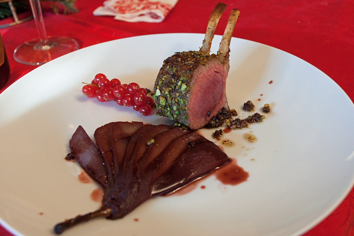 Pulito e parato il carrè e rosolato in olio e burro per un paio di minuti, Lasciato leggermente raffreddare e poi passato in una granella di pistacchi e messso al forno a 200° per 6/7 minuti. Servito solo con pere cotte nel Porto (nel senso del vino eh.....non che sono andato a Genova a cuocerle....)