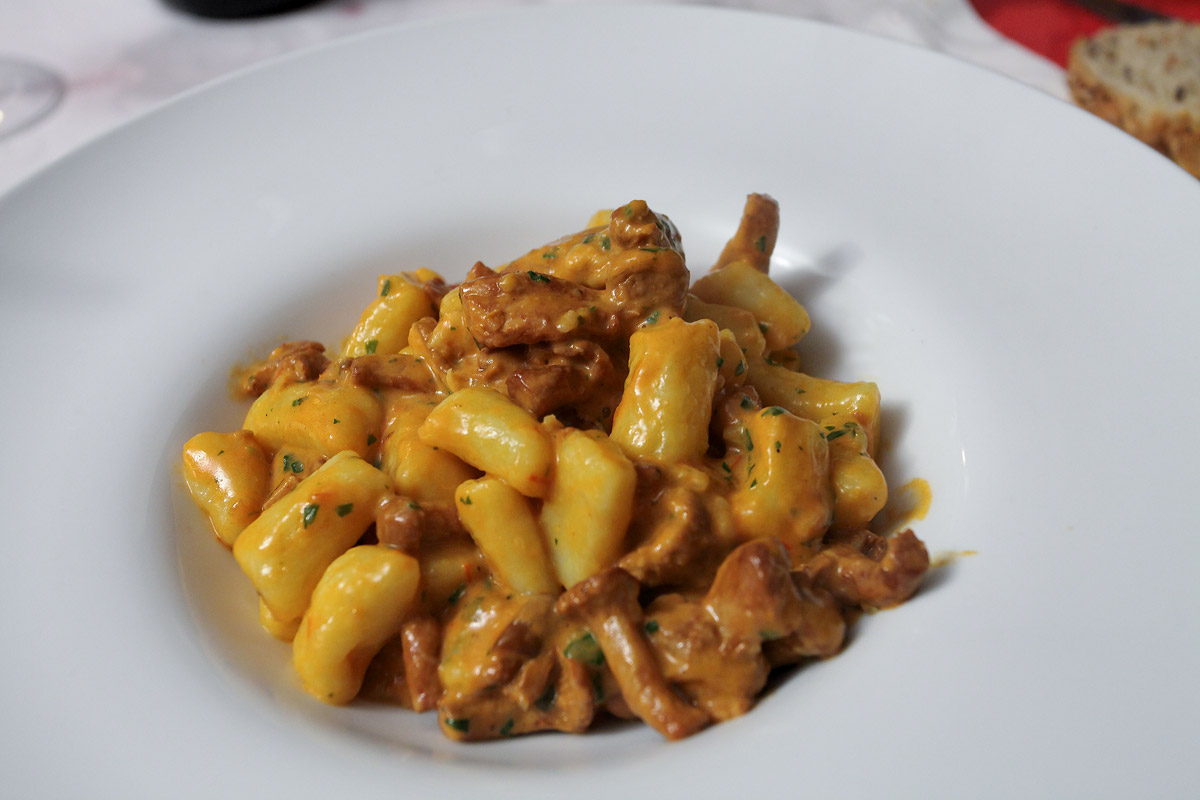 Dei classici gnocchi di patate serviti con un sugo di finferli ( colti in estate e conservati in freezer) spadellati con burro e aglio a cui ho aggiunto della salsa di pomodori del mio orticello , qualche cucchiaio di panna e del prezzemolo.