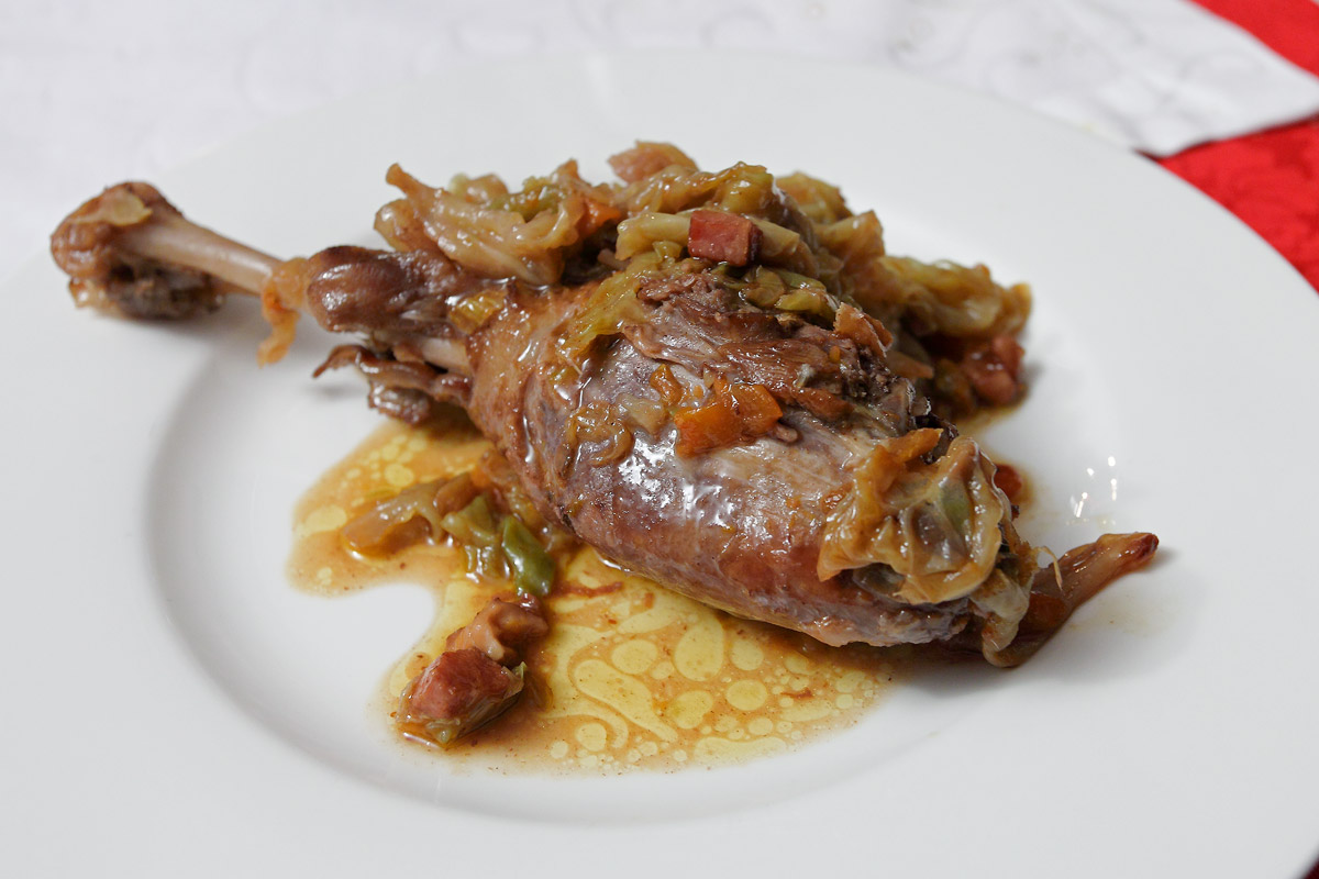 In questo grasso, soffriggete una brunoise di sedano,carota e cipolla assieme alla pancetta a dadini. Dopo una decina di minuti, aggiungete le verze tagliate a strisce e continuate la cottura almeno per altri 20/25 minuti fino a quando le verze non si siano ben ridotte di volume. Unite l'oca e i gherigli di noci spezzettati e portate a cottura ( servira' almeno un'altra ora buona). Regolate di sale e pepe negli ultimi minuti di cottura e servite ben caldo.