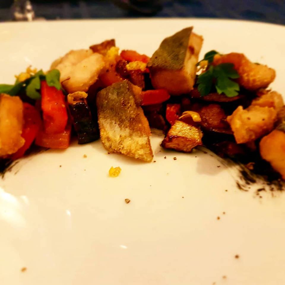 verdure aggiungendo i tocchetti di pesce e decorare a piacere con mandorle a lamella. Se