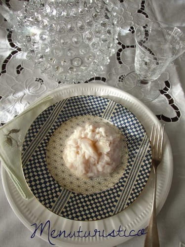 * la foto che vedete, si riferisce al primo tentativo, quando mi sono attenuta (più o meno) alle dosi: la seconda volta, al corso di cucina, ho aumentato di 50-70 g la dose di formaggio e il risotto si è "legato" di più e meglio