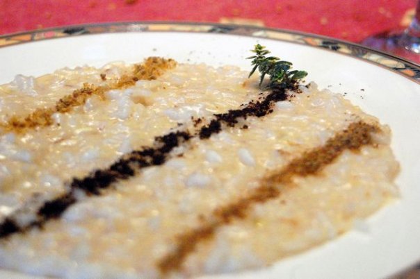 Cosa ho cambiato? l'originale prevedeva riso carnaroli Acquerello (http://www.acquerello.it), ma io non l'avevo e non intendevo prenderlo in quest'occasione (ma prima o poi lo faro'). Inoltre Claudio prevede un formaggio tipo stracchino, ma io amo i sapori piu' decisi e ho scelto un pecorino nero.