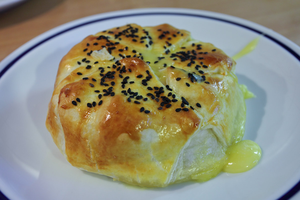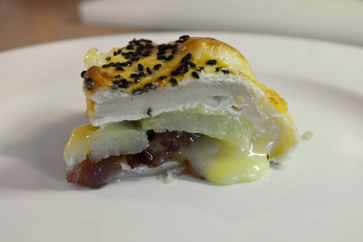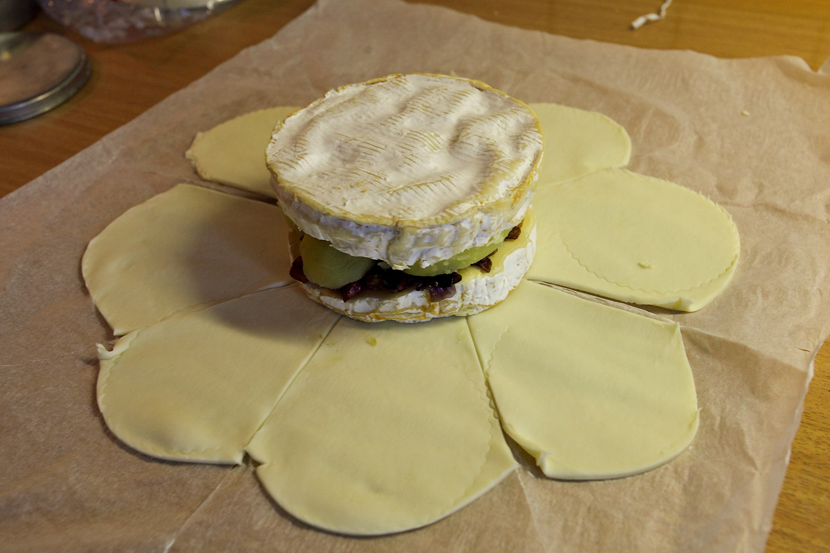 Chiudere con l'altra meta del Camembert e ricoprire con la sfoglia che intanto avrete diviso in otto parti e ritagliata a guisa di petali di un fiore.