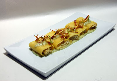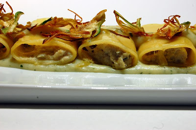 Stendere una parte di crema sul piatto da portata, disporre gli schiaffoni in sequenza, e, sopra, il carciofo fritto.