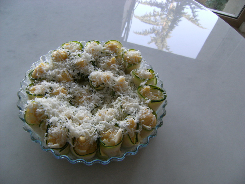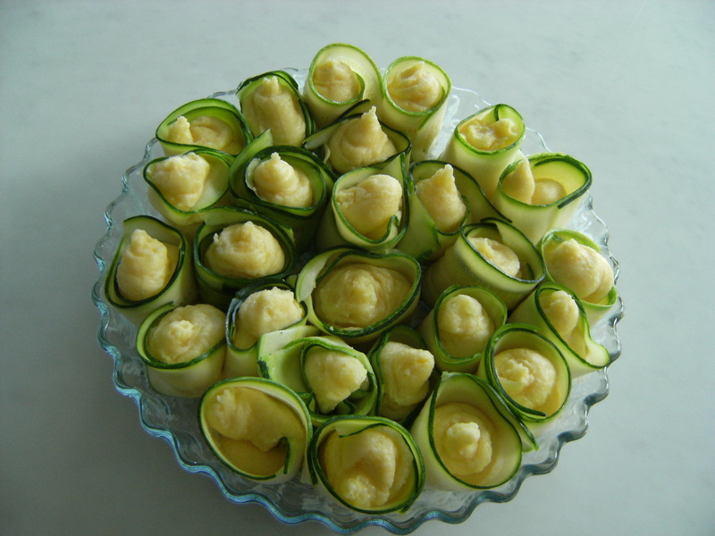 Condite con sale, pepe, i tuorli e il parmigiano. Intanto affettate le zucchine per il lungo, con la mandolina, ricavando circa 50 fette. Lessatele in acqua bollente salata per 30 secondi; scolatele e poggiatele su un canovaccio.