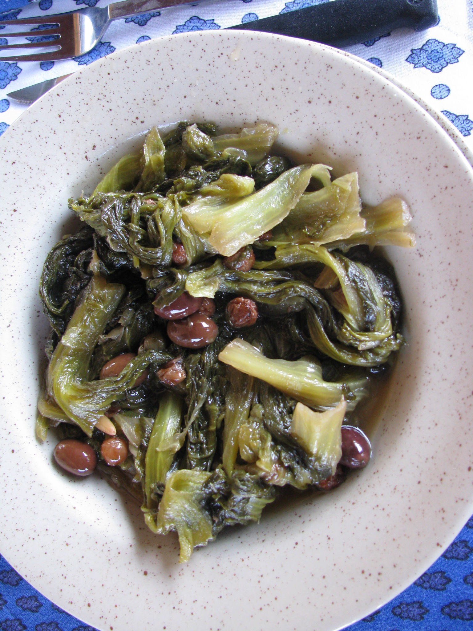 Mondare l'insalata levando le foglie esterne più brutte, poi sfogliarla lavando le foglie una ad una; farle scolare. In una capace pentola mettere due cucchiaiate di olio con lo spicchio d'aglio schiacciato e farlo colorire poi levarlo. Unire l'insalata e farla insaporire, quindi bagnarla con uno spruzzo di vino bianco che si lascerà evaporare, Aggiungere le olive, l'uvetta, i pinoli e i capperi dissalati, mescolare bene, coprire la pentola e far cuocere per circa 30 minuti. Assaggiare poi caso salare e pepare, continuando la cottura per altri 20/30 minuti (la canasta è un po' coriacea) o secondo il vostro gusto. Servire in fondine sul cui fondo si sarà messo del pane abbrustolito.