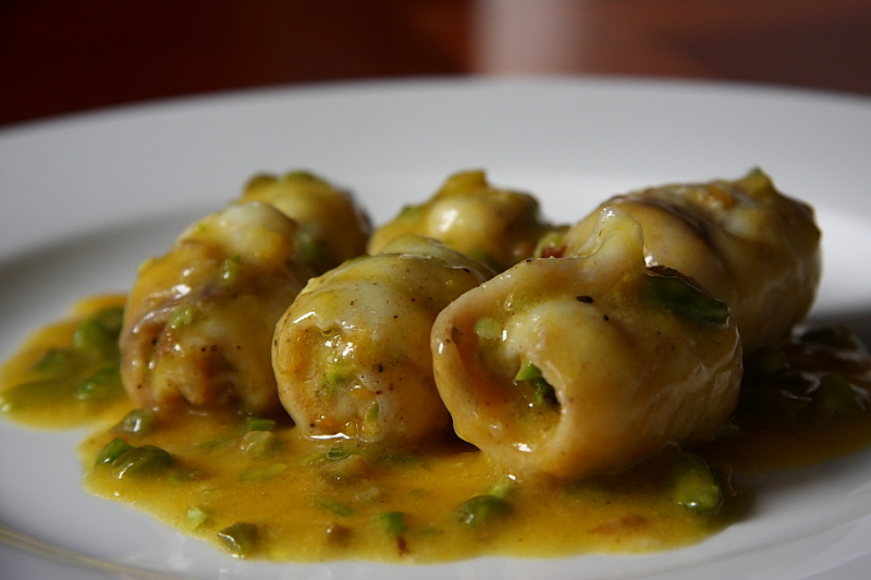 Allineare i filetti su un tagliere, salarli, peparli e farcirli con il mix di pistacchi e buccia d’arancia.