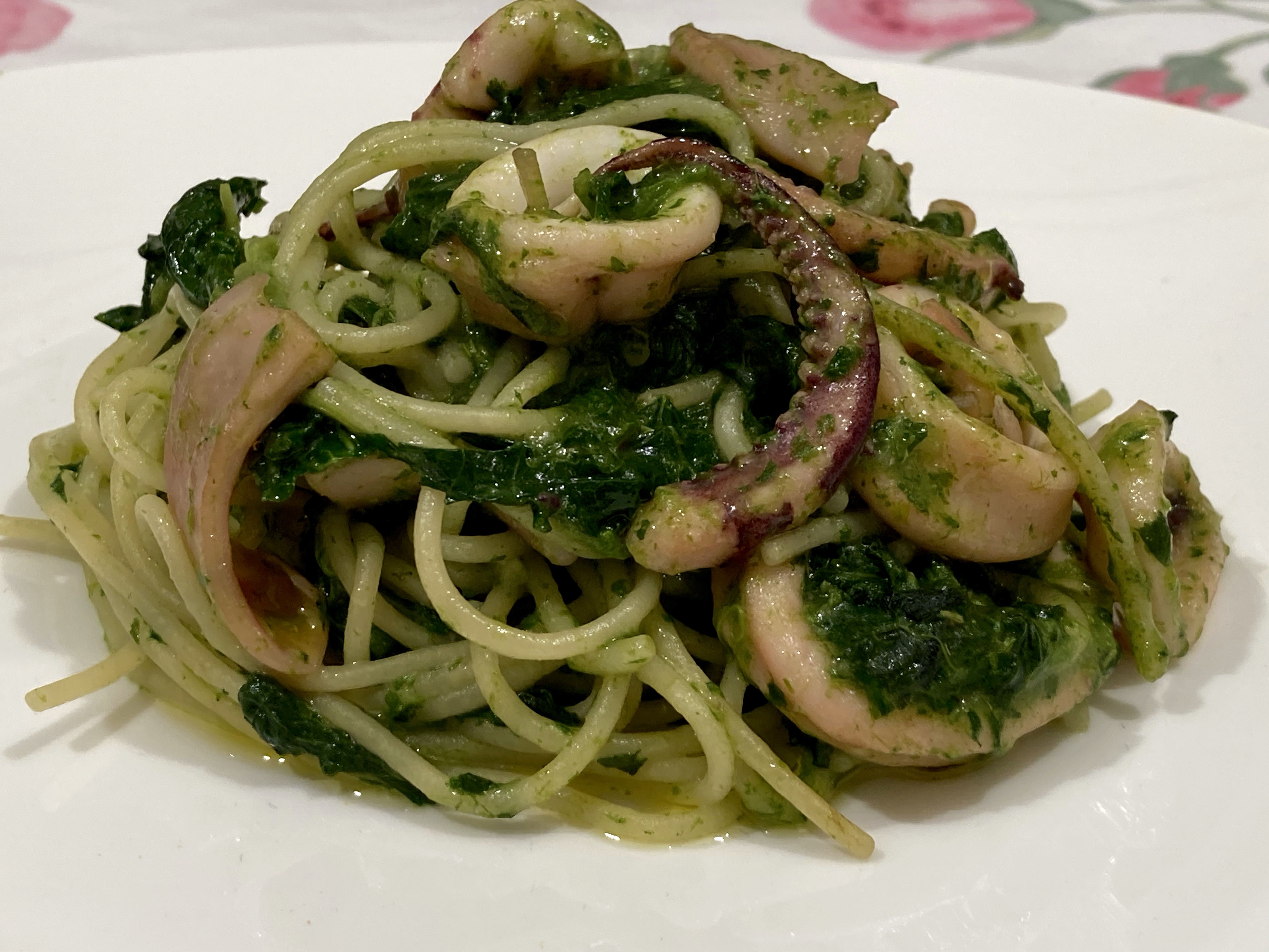 Aggiungere i totani interi se sono piccoli quindi tenerissimi ; stanno pronti in pochi minuti, spruzzarli con poco vino bianco aggiungere quindi i broccoli lessi e far amalgamare i sapori . Versare nel tegame la pasta cotta molto al dente ed aggiungere poco alla volta acqua di cottura della pasta per portarla al giusto punto e "risottarla".