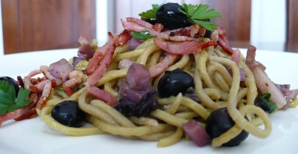 Preparare gli spaghetti con 100 gr di farina, 3 tuorli, sale. Impastare bene, poi tirare la sfoglia fino alla terza tacca dell’Imperia. Passare adesso nella trafila dei tagliolini, si otterrà uno spaghetto simil-chitarra.