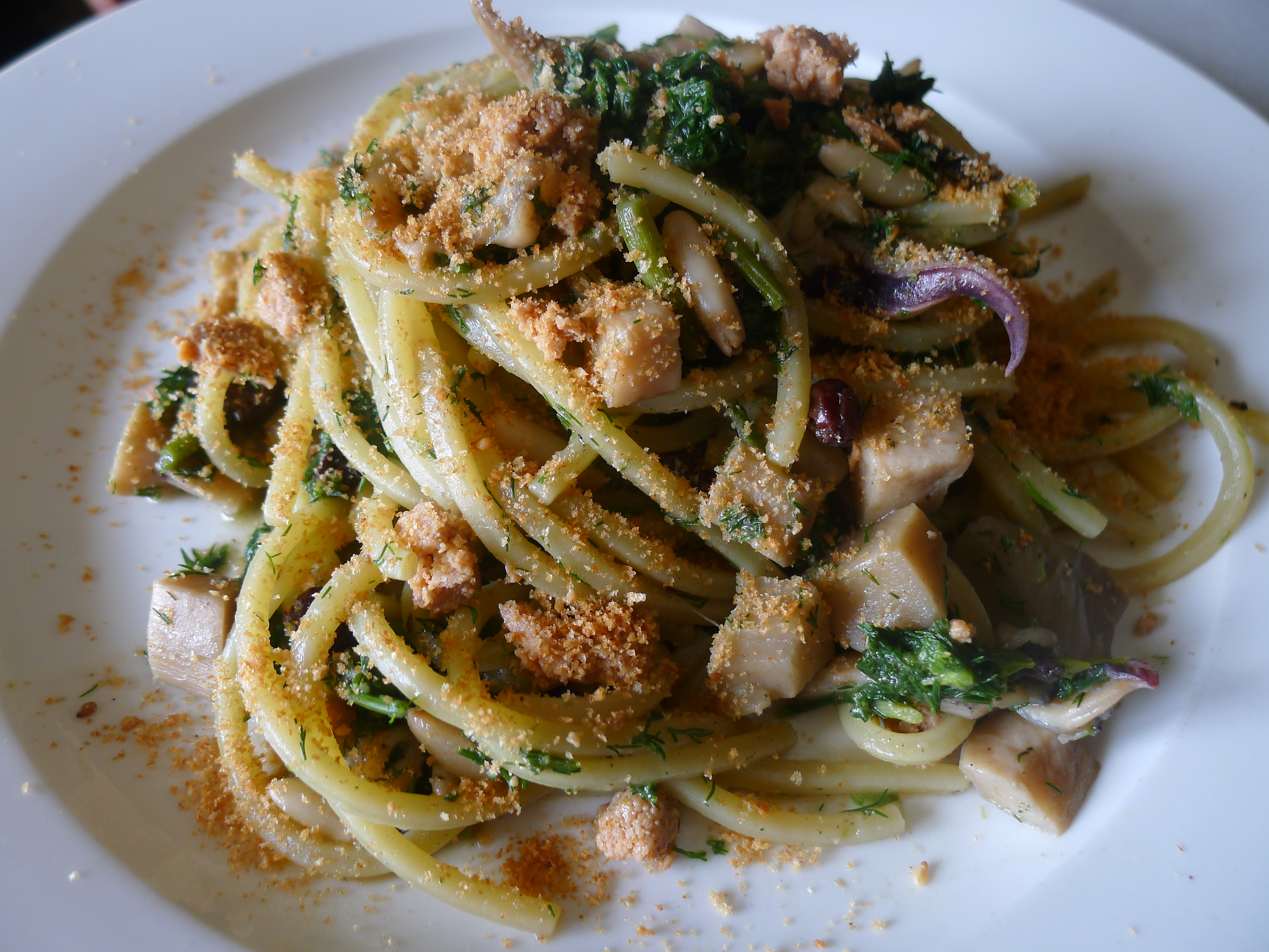 Cuocere lo spaghettone nell'acqua di cottura del finocchietto, scolare al dente e rigirarla per qualche minuto in padella con il condimento e macinata di pepe.