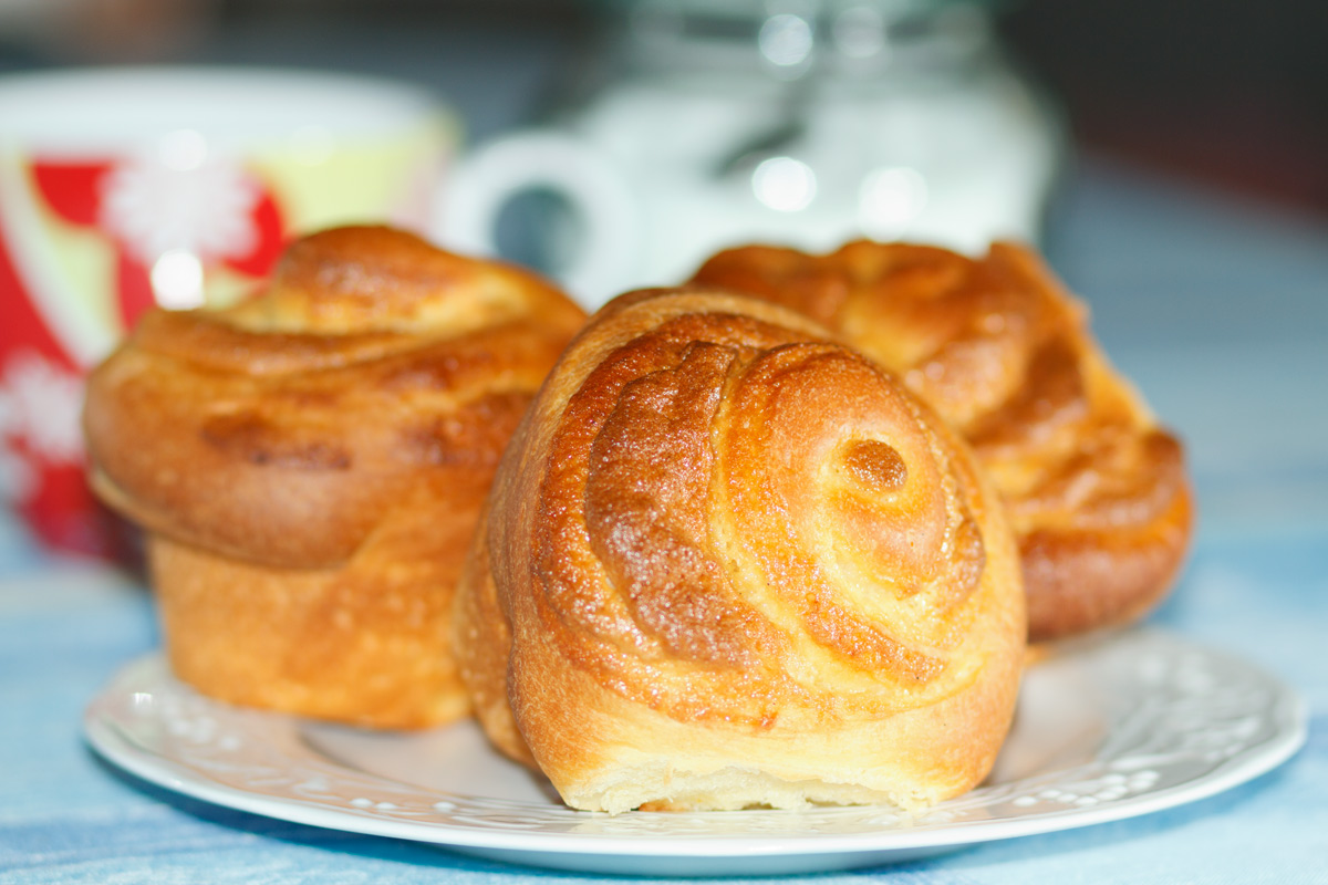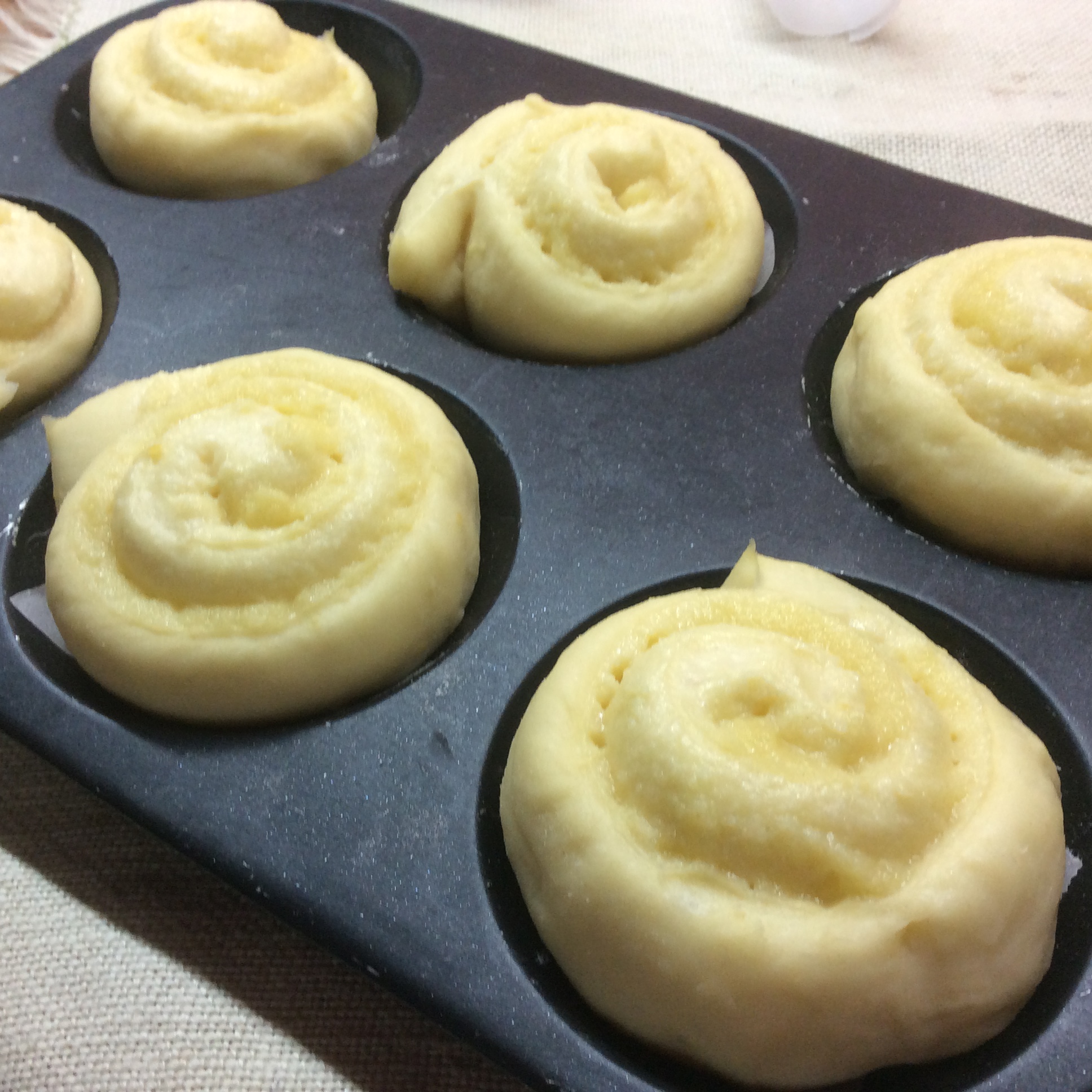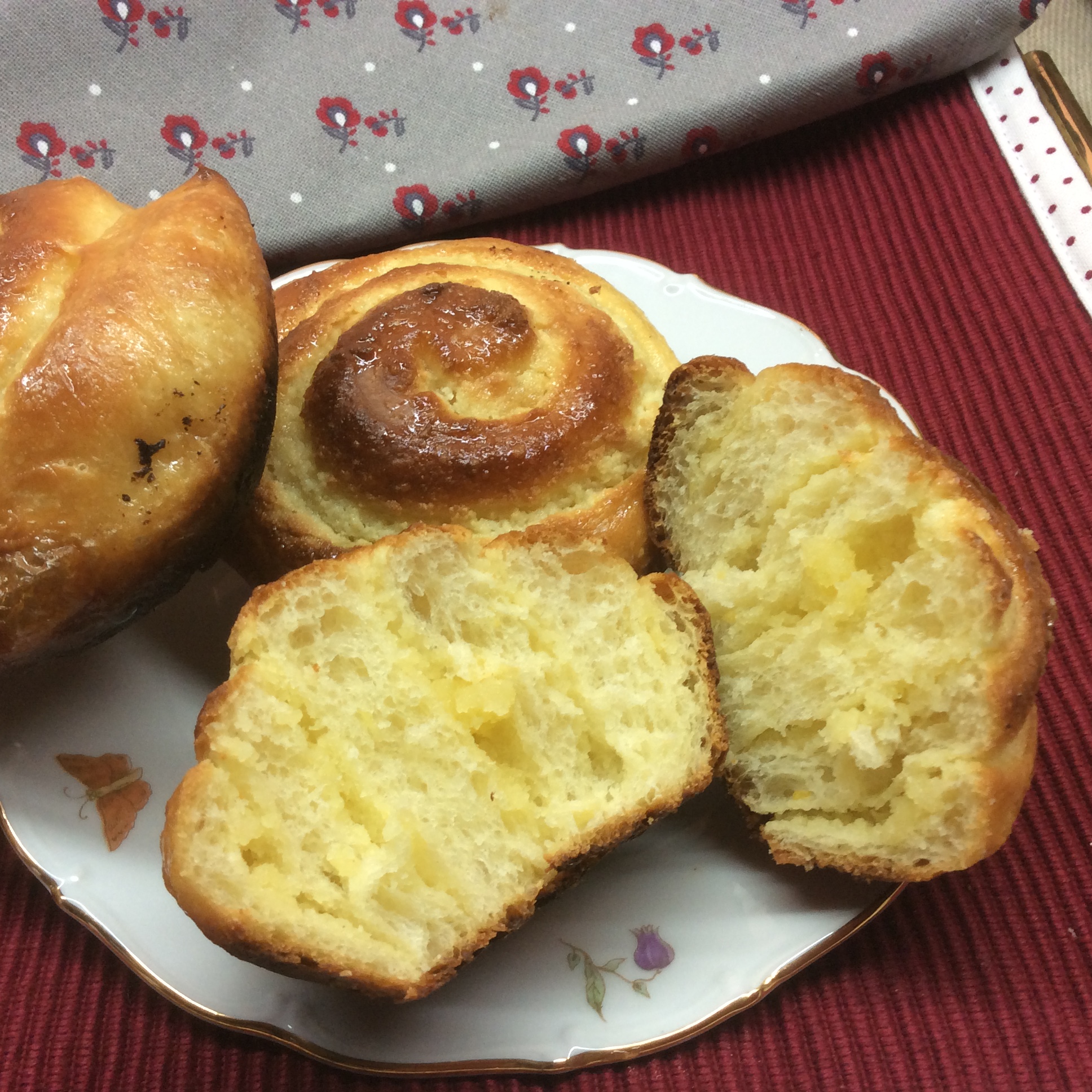 Tagliare dei pezzi di 50-60 g e metterli negli appositi stampi di cottura (una teglia da muffin potrebbe andar bene) oppure disporli in una teglia a bordo alto l’uno vicino all’altro. Far lievitare fino al raddoppio (circa 90 minuti) a 24-26° (ho messo sempre in forno spento). Dorarli con un uovo sbattuto e cuocere a a 180° per 15 minuti (se singolo, un po’ di più se messi tutti insieme).